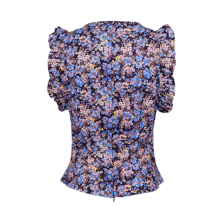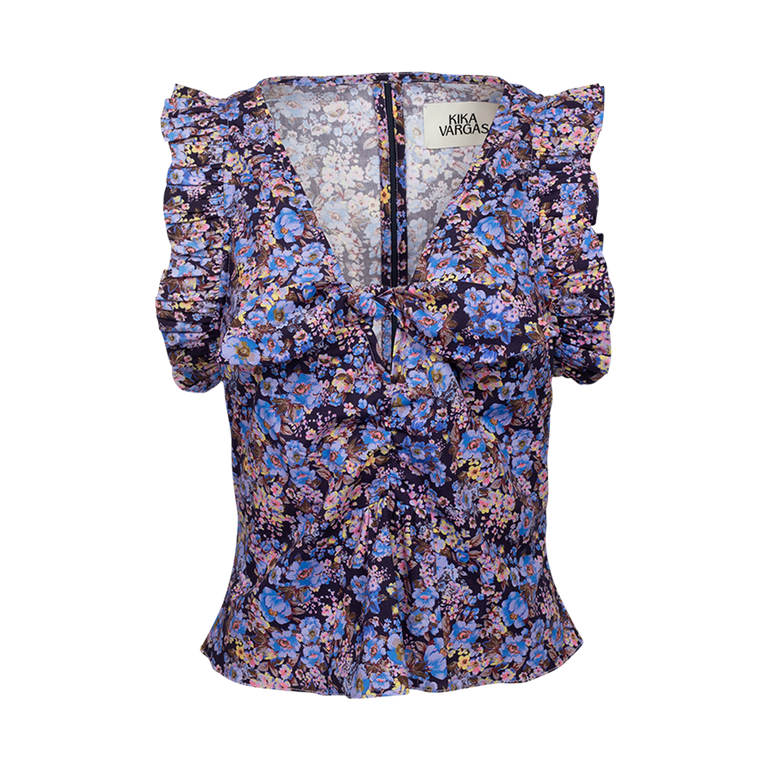 Sleeveless top with plunging neckline, ruffled armholes and bow detail at bust.