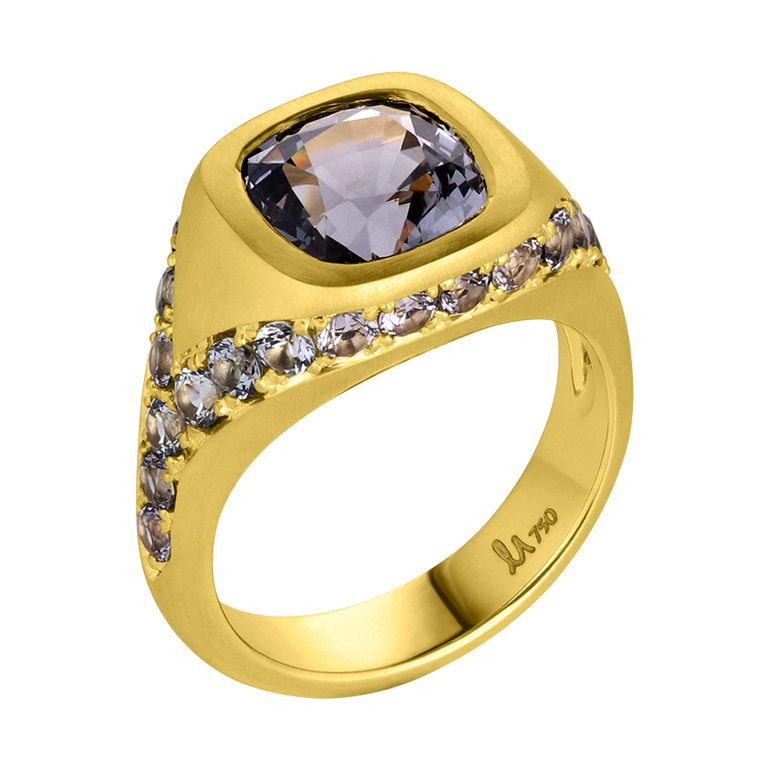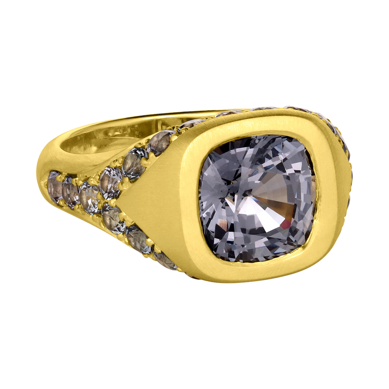 One-of-a-kind ring featuring approx. 4.37 CT. grey spinel center stone and approx. 4.81 CT. T.W. grey spinel pavé. Size 8.0.