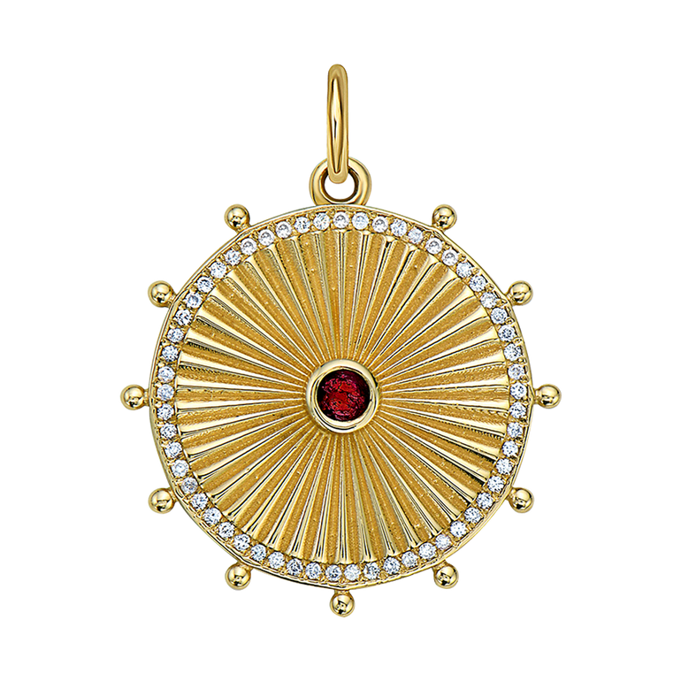 Handcrafted medallion with 0.10 CT. ruby center stone and 0.32 CT. T.W. diamonds. Approx. 22MM.