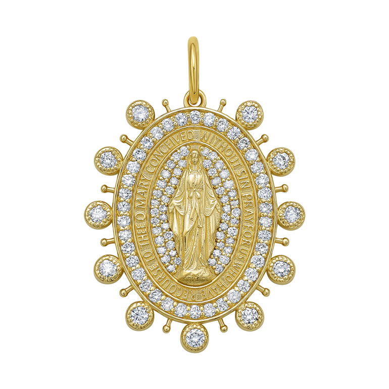 Handcrafted Mary medallion charm with 0.95 CT. T.W. diamonds. Approx. 27MM x 23MM.