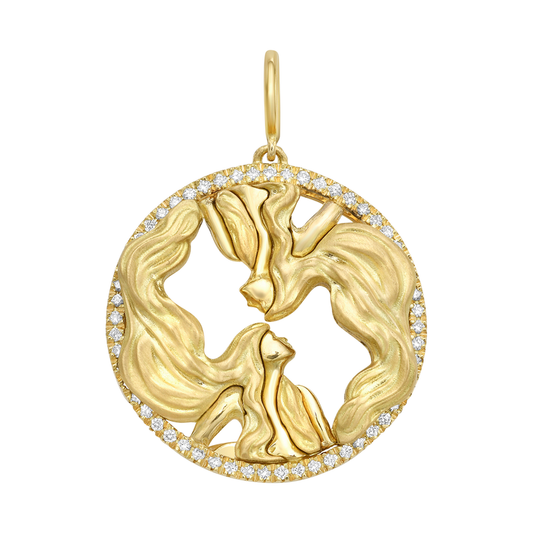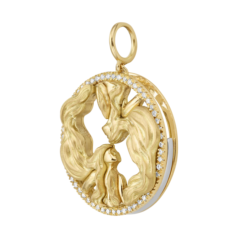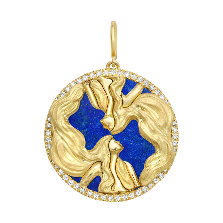 Interchangeable gemini zodiac charm with 0.25 CT. T.W. diamonds. Comes with 12 different interchangeable gemstone discs, including: Lapis Lazuli, Turquoise, Red Coral Paste, Malachite, Black Mother of Pearl, Mother of Pearl, (Dyed) Blue Mother of Pearl, Teal Mother of Pearl, Purple Mother of Pearl, Red Mother of Pearl, Pink Mother of Pearl and Green Mother of Pearl.