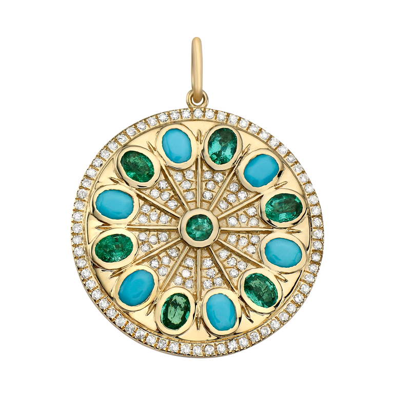 Amulet charm with 1.15 CT. T.W. diamonds, 1.06 CT. T.W. turquoise and 0.95 CT. T.W. emeralds.