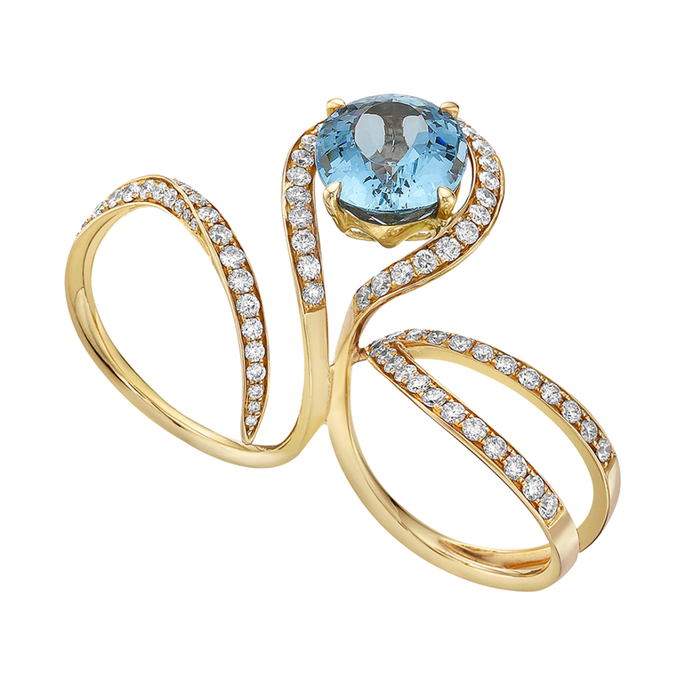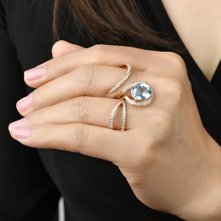 Cocktail ring designed with double bands and 4.55 CT. T.W. aquamarines with 1.11 CT. T.W. diamonds. Band: 2.55MM. US size 8.
