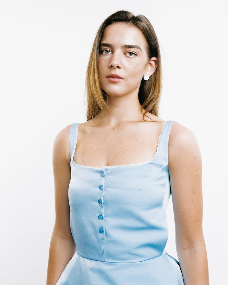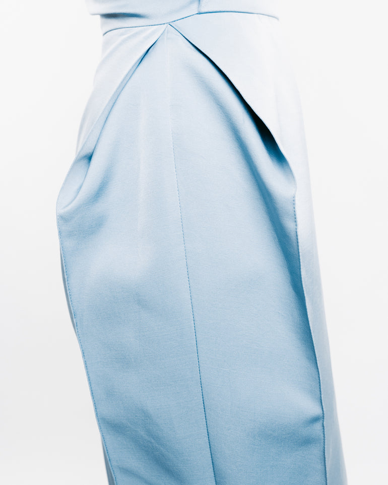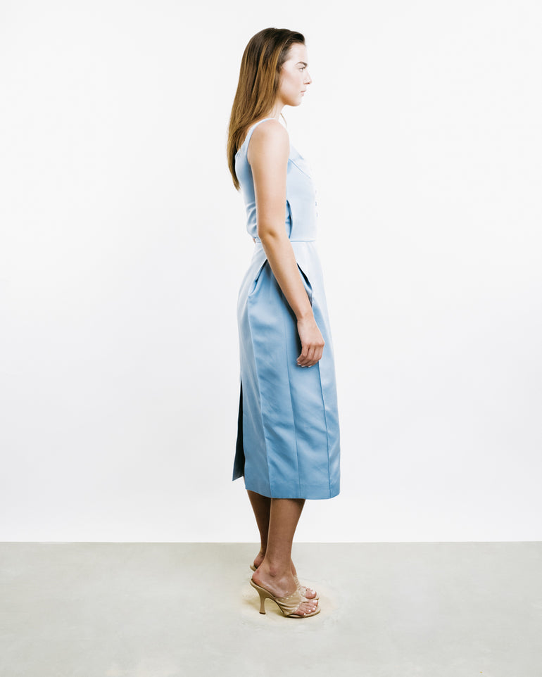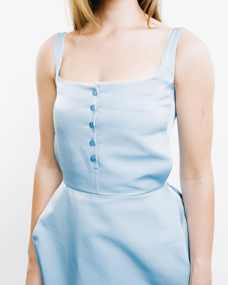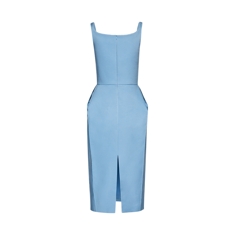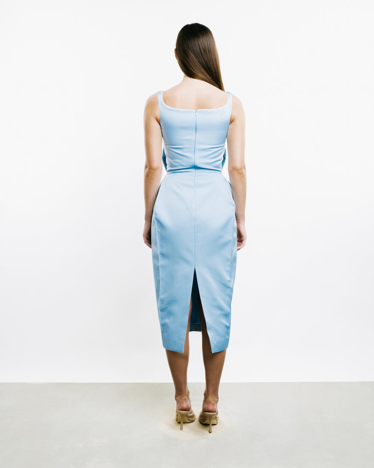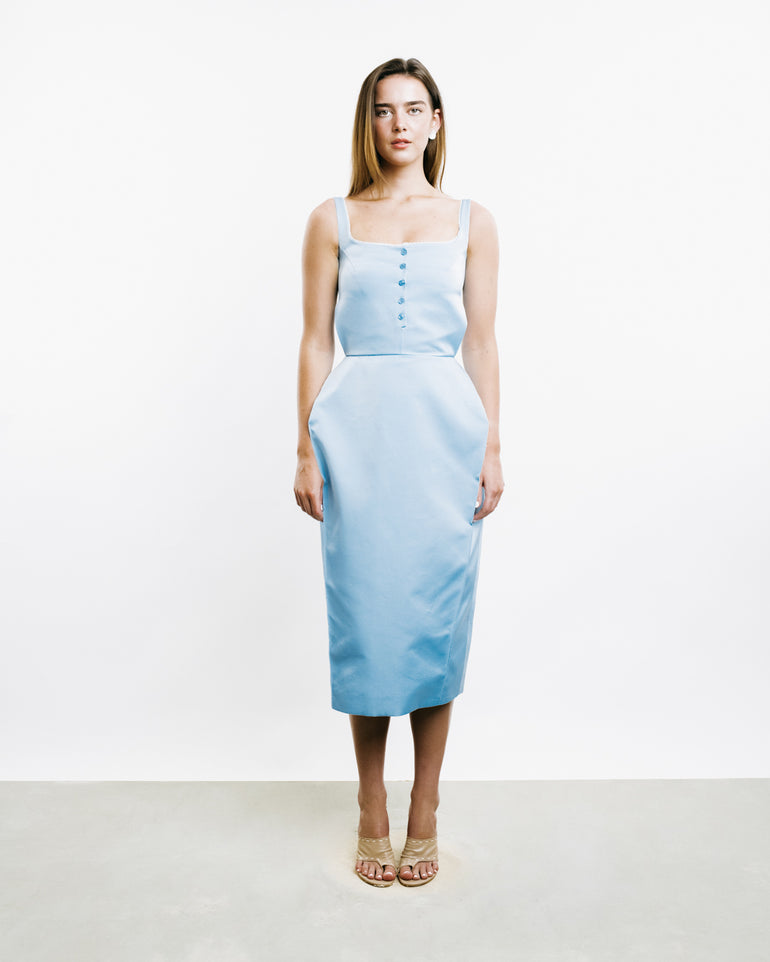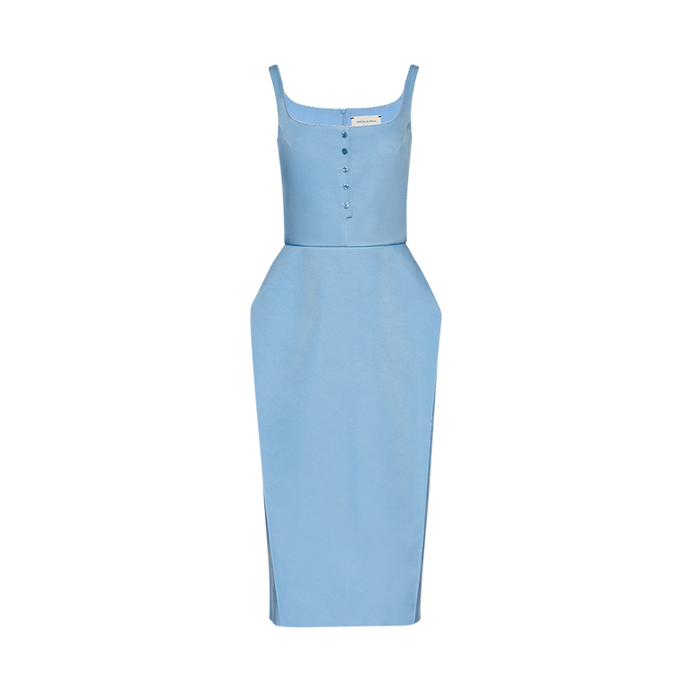 Midi dress in exaggerated hourglass shape with hip pads and button up chest detailing.