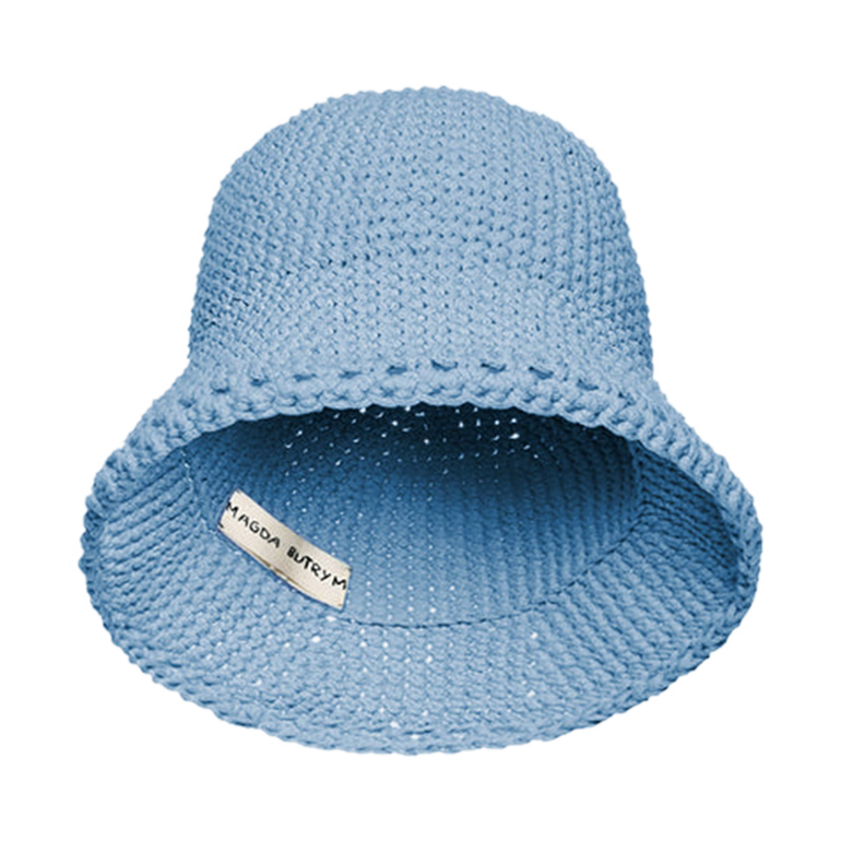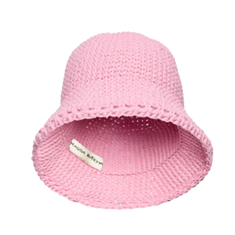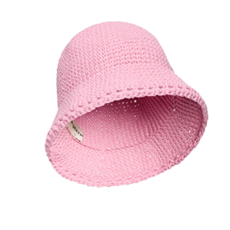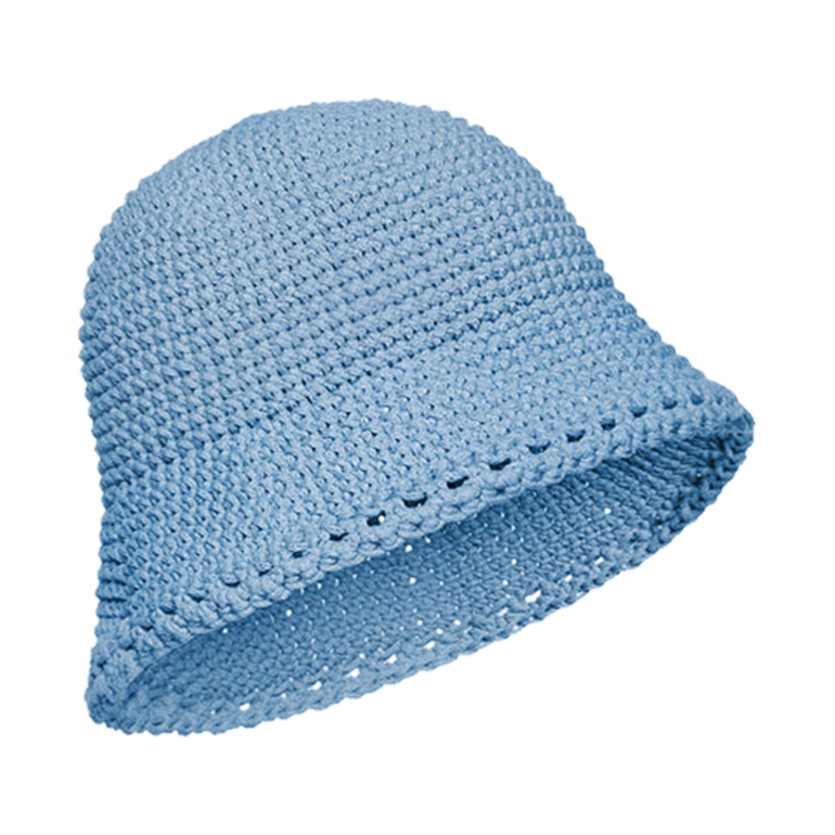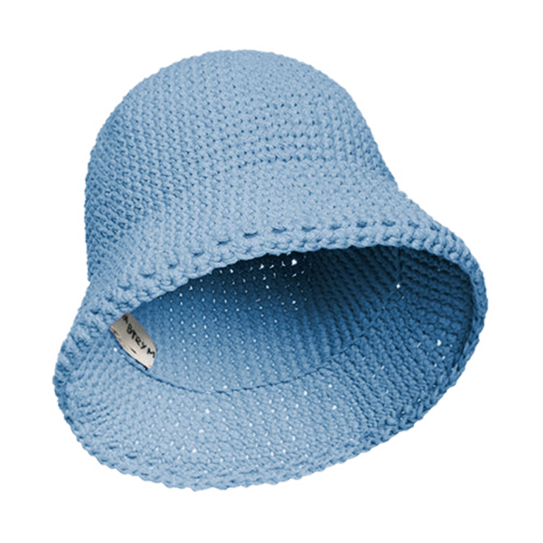 Crocheted bucket hat with flexible rounded crown and gently flared brim.