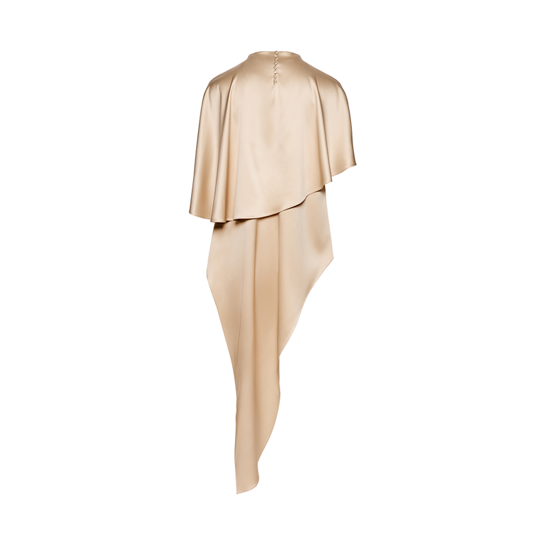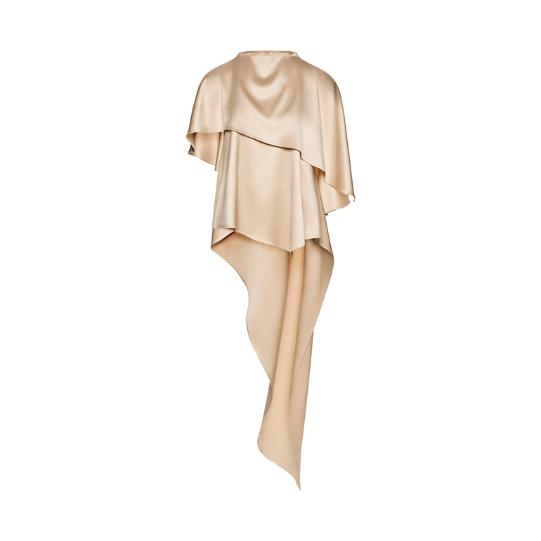 Silk top in draped design with high neckline, asymmetric short sleeves, dramatic high-low hem and back zip.