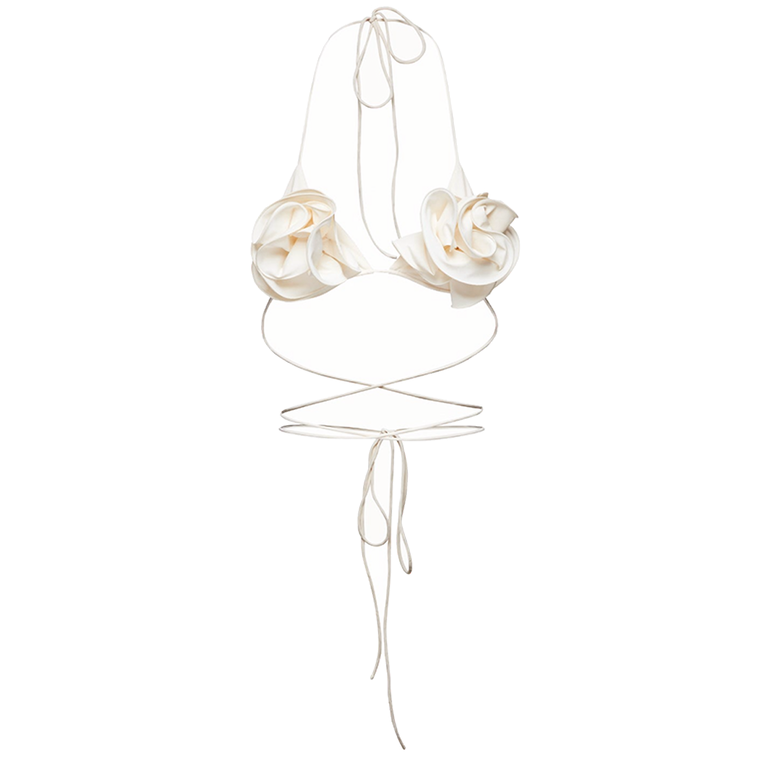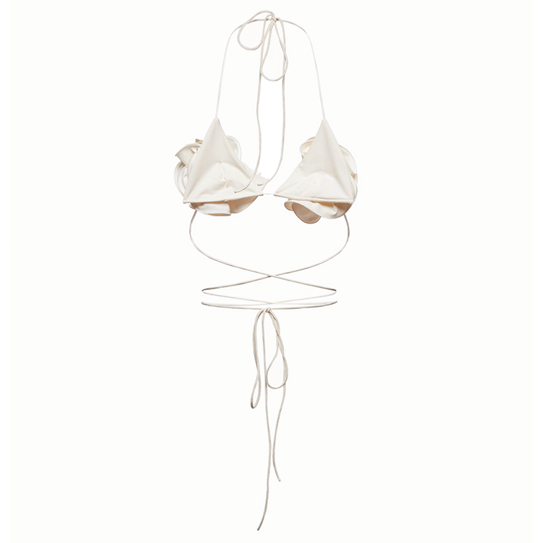 Strappy swim top with extra long straps create a crisscross at the waist, with non-padded adjustable triangle cups at the bust, 3D floral appliqué at front.