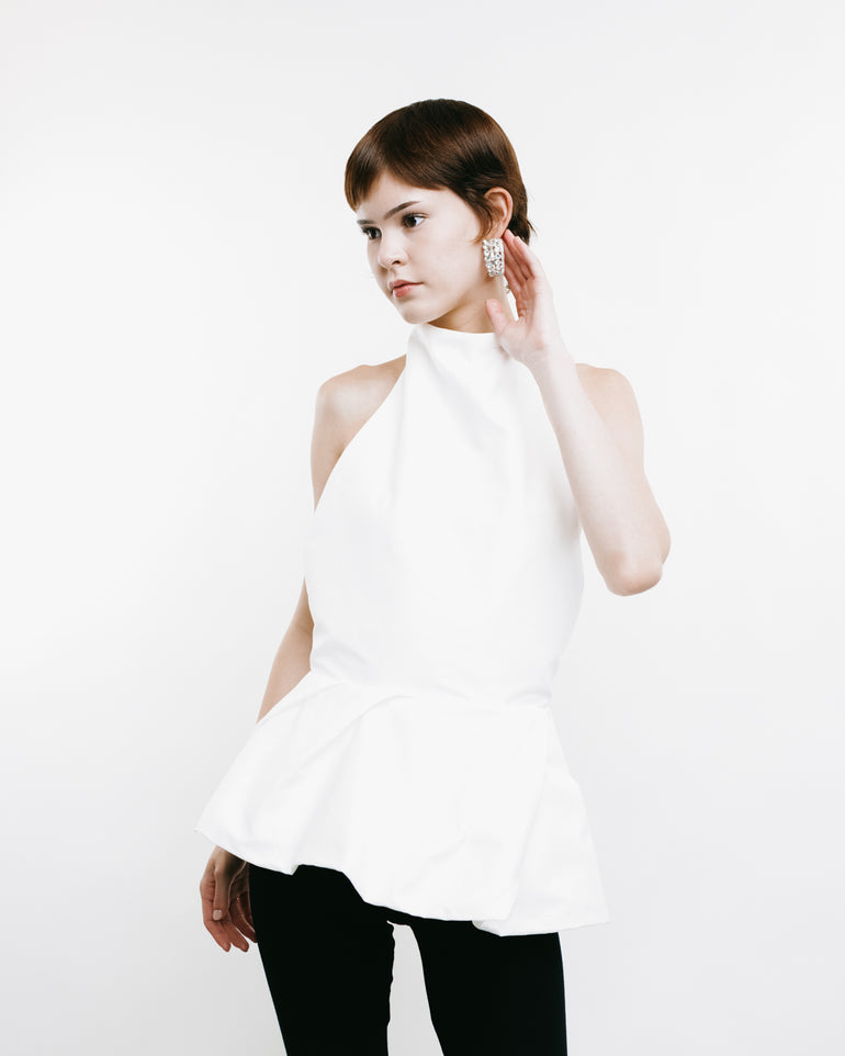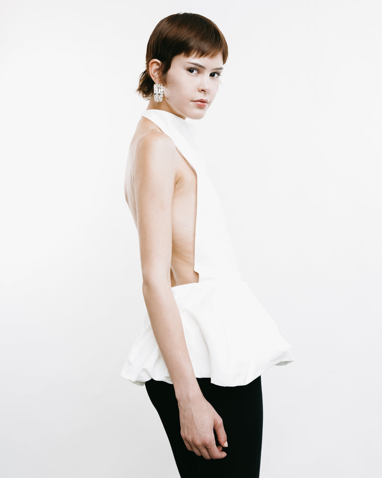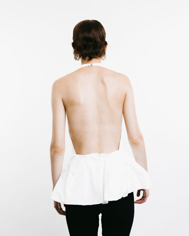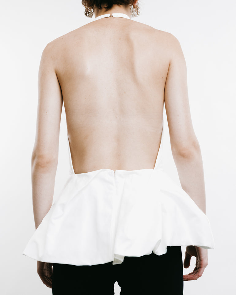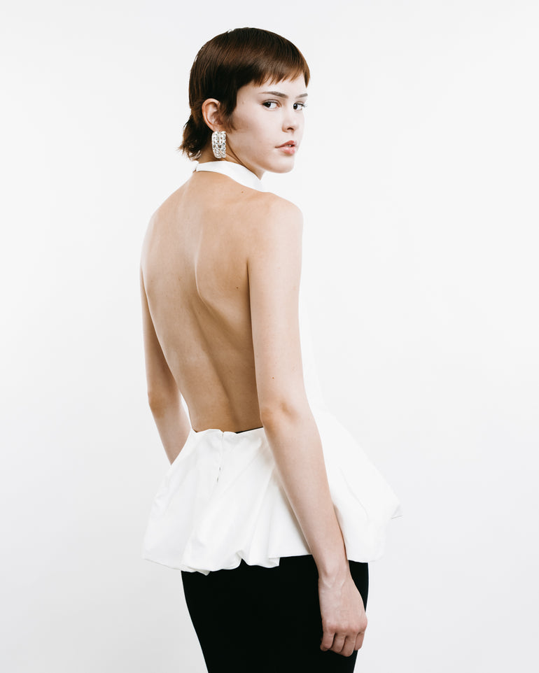 Sleeveless top with halter neckline, flared peplum hem and open back. Lined.