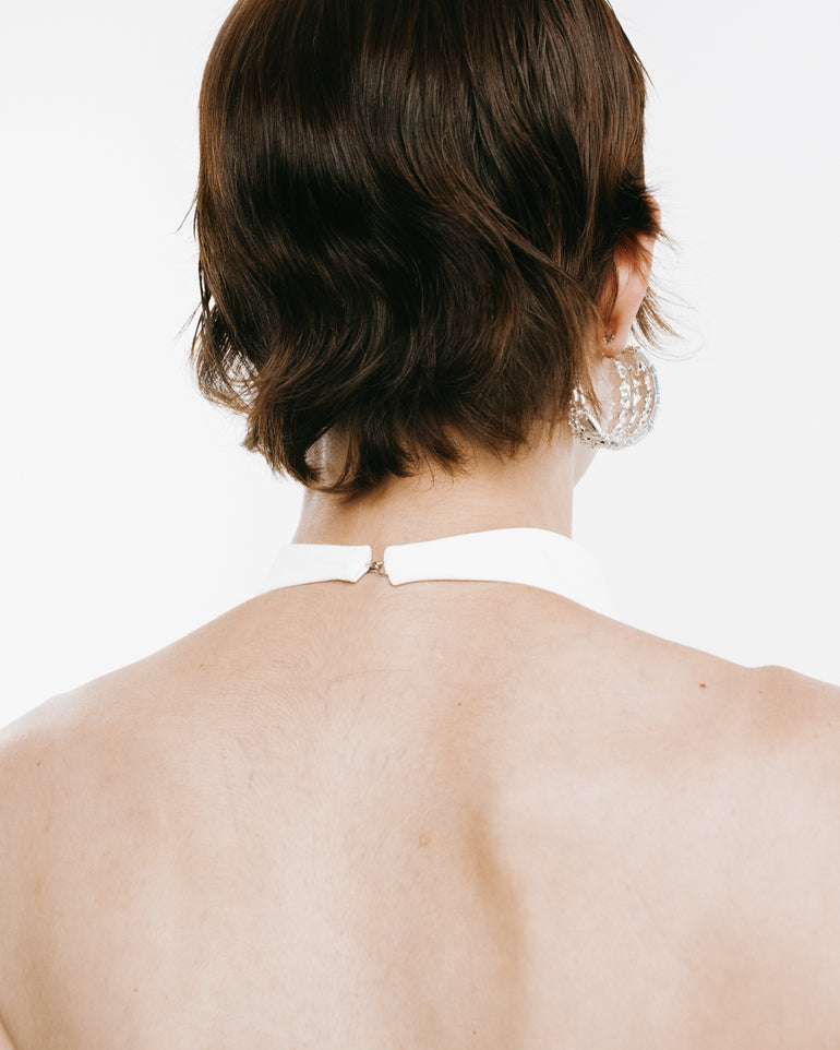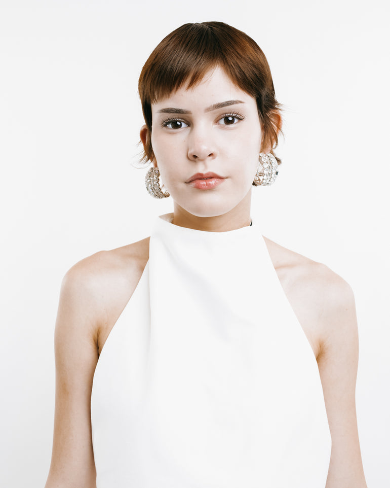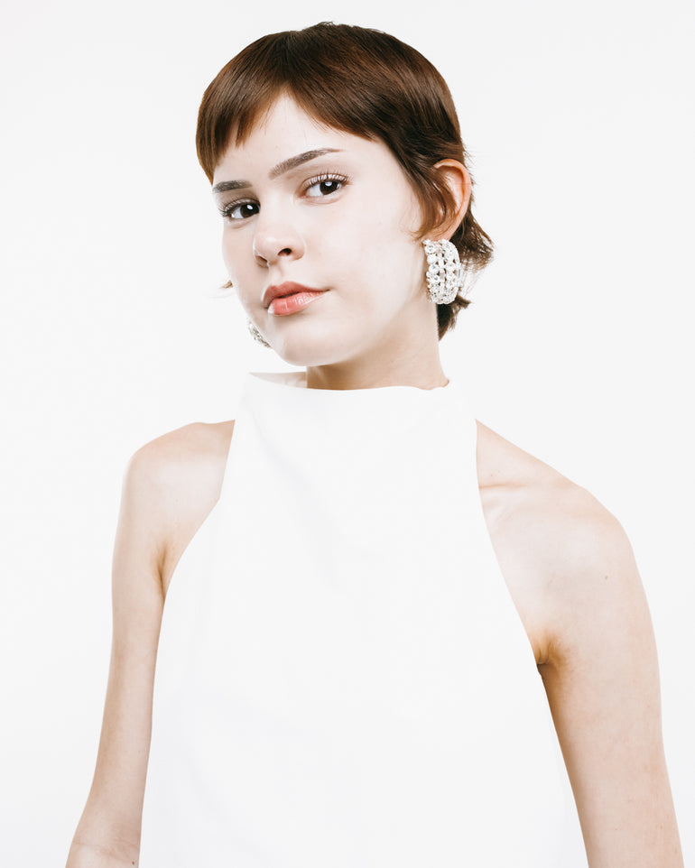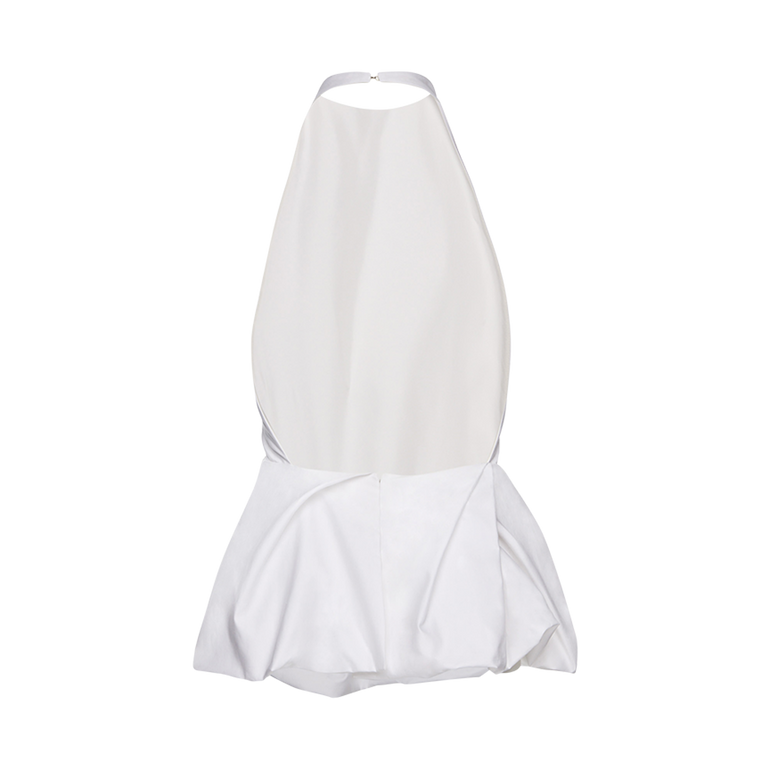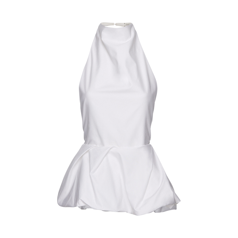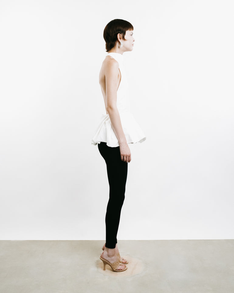 Sleeveless top with halter neckline, flared peplum hem and open back. Lined.