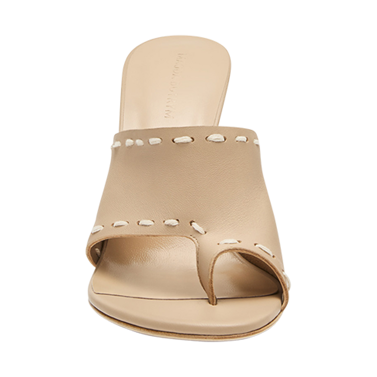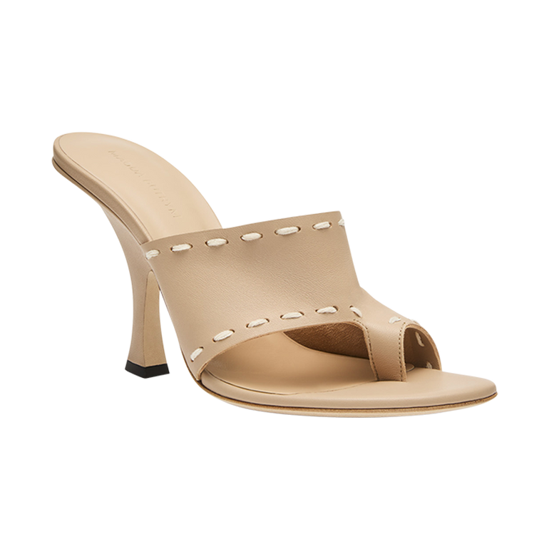 Sandals with wide vamp, thong toe strap, stitching detail and flared heel.