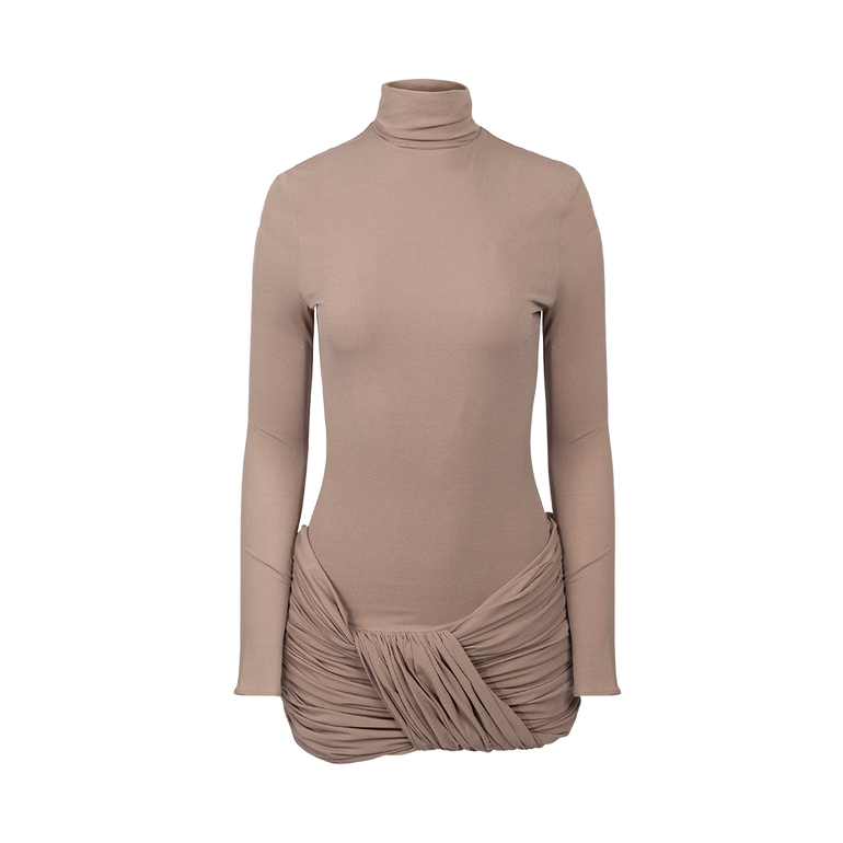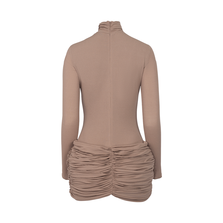Minidress with long sleeves, high neckline and voluminous, fabric-wrapped trim at skirt.
