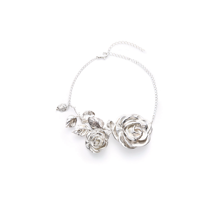 Statement necklace featuring sculpted roses and leaves with adjustable clasp closure.