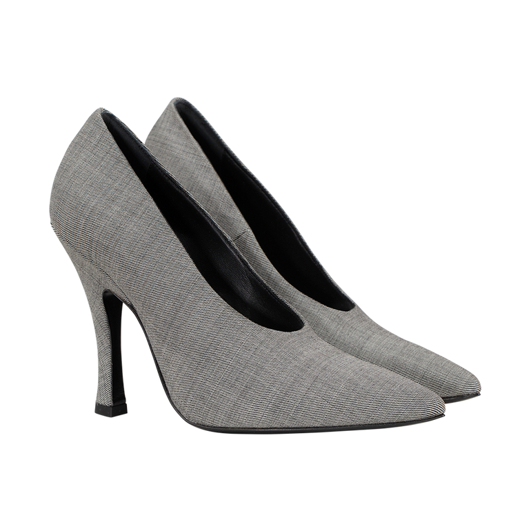 Pumps with pointed toe and curved, architectural heel.