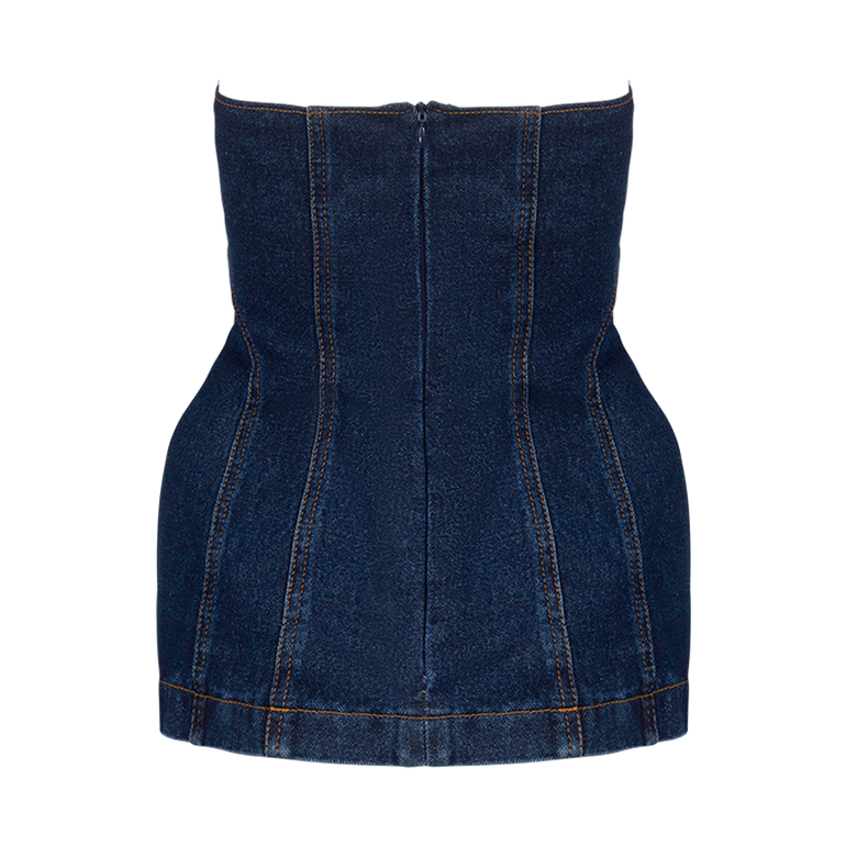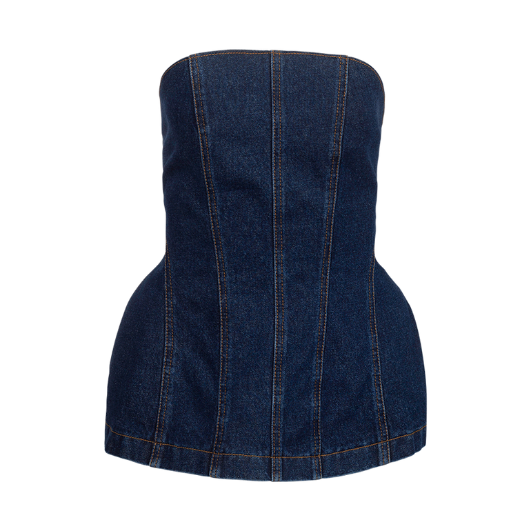 Sculpted corset top with strapless neckline, contoured panel construction and back zip.