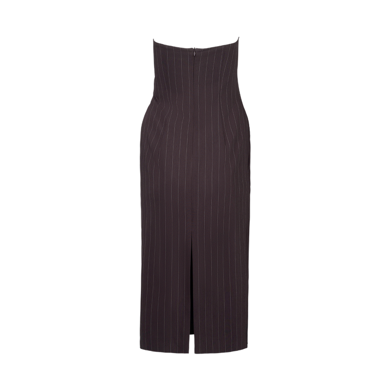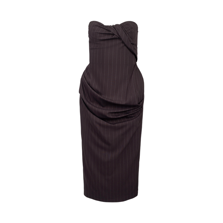 Strapless midi dress with twisted detail at bust, gathering and draping at hip and concealed back zip. Lined.