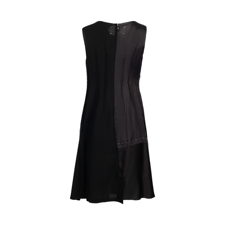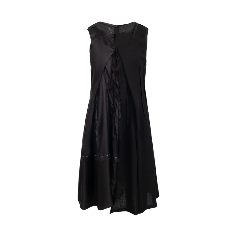Sleeveless midi dress in layered construction with drawstring detail at chest, raw edges and irregular hem.