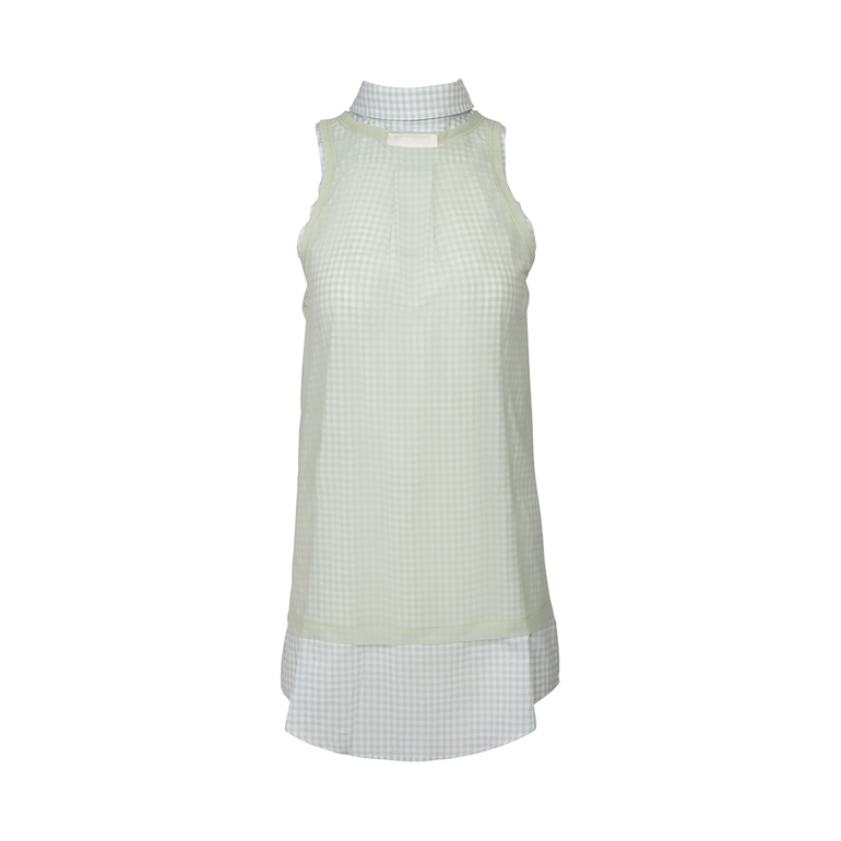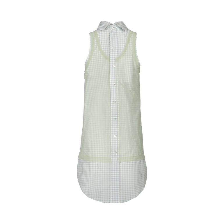 Sleeveless tank top in check motif with spread collar, A- line fit, rounded hem and back button closure.