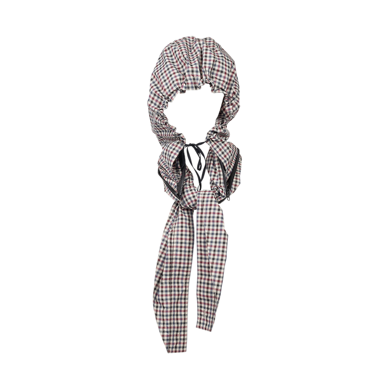 Draped scarf hood with zipped hood and adjustable drawstring.