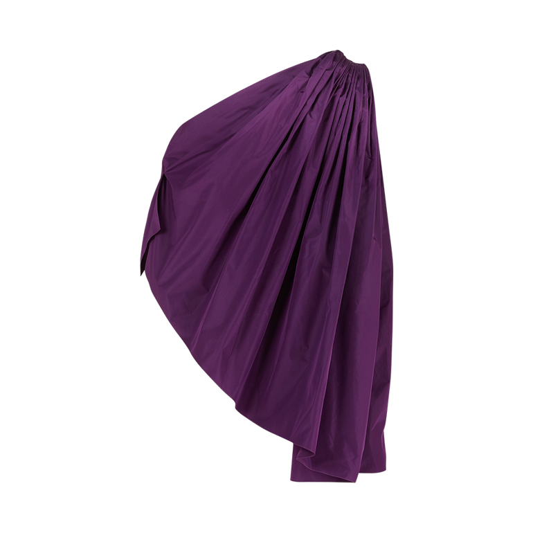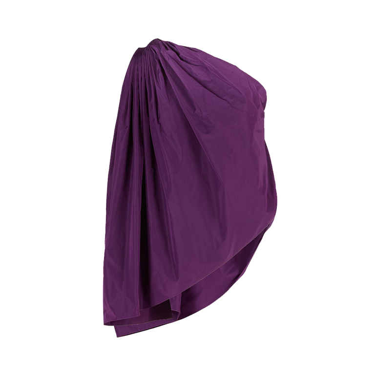 One-shouder top with gathering at shoulder and asymmetrical cut.
