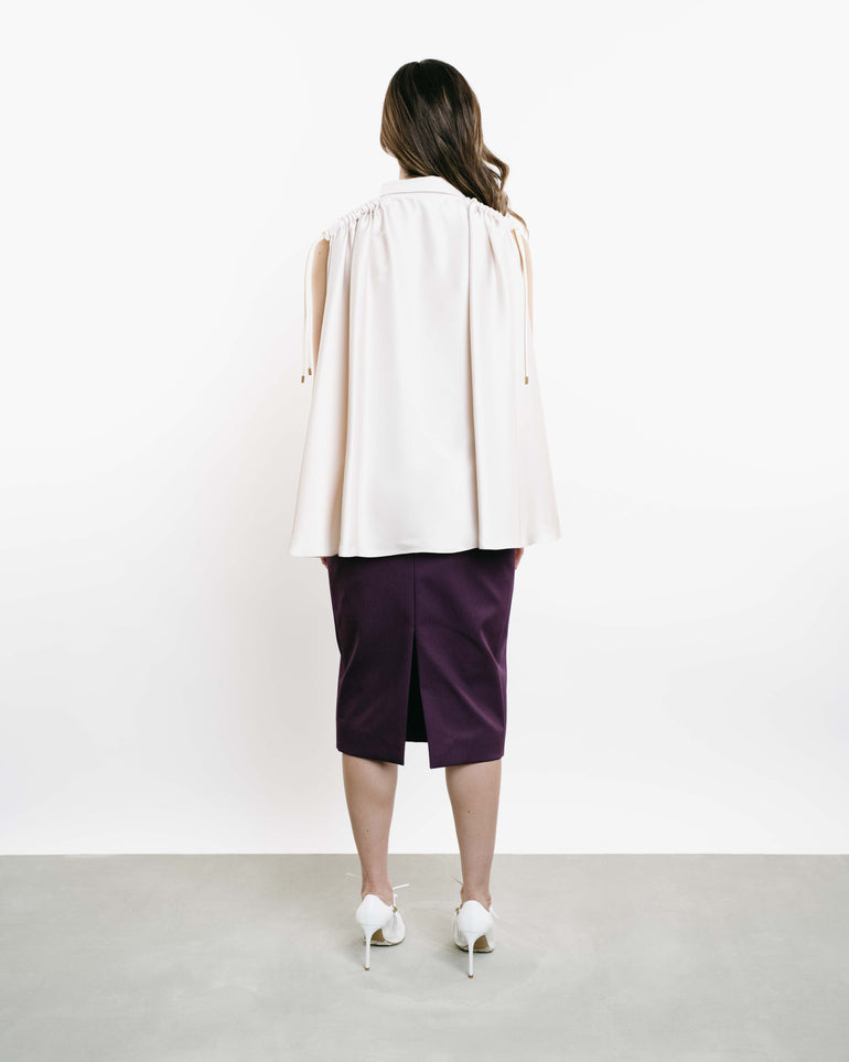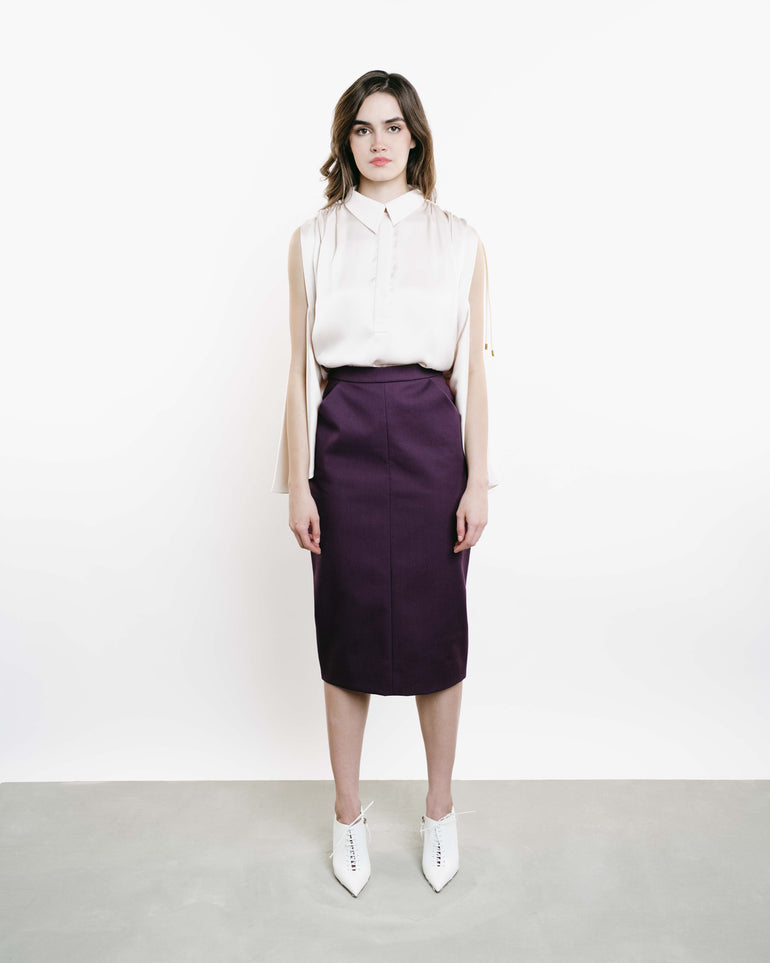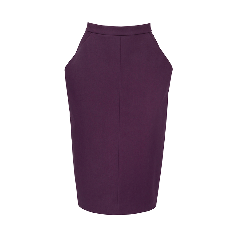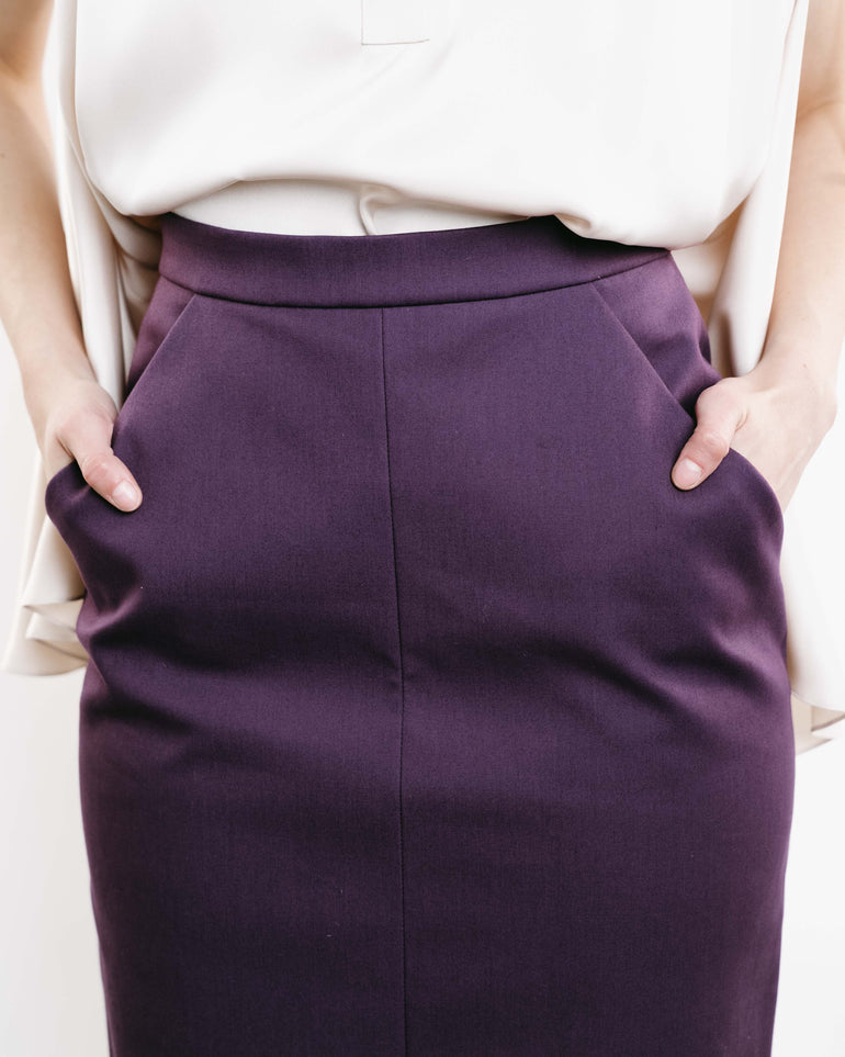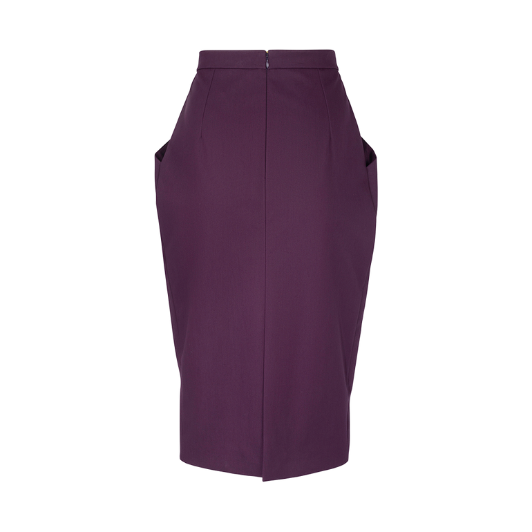 Midi skirt in pencil silhouette with exaggerated side pockets and back zip. Lined.