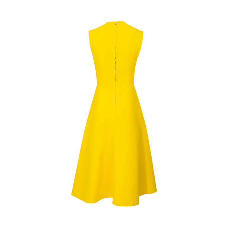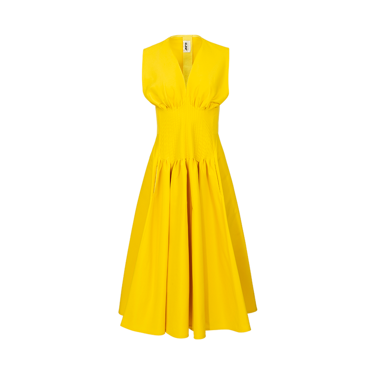 Sleeveless midi dress with V-neckline, pleated corset, side pockets and back zipper.