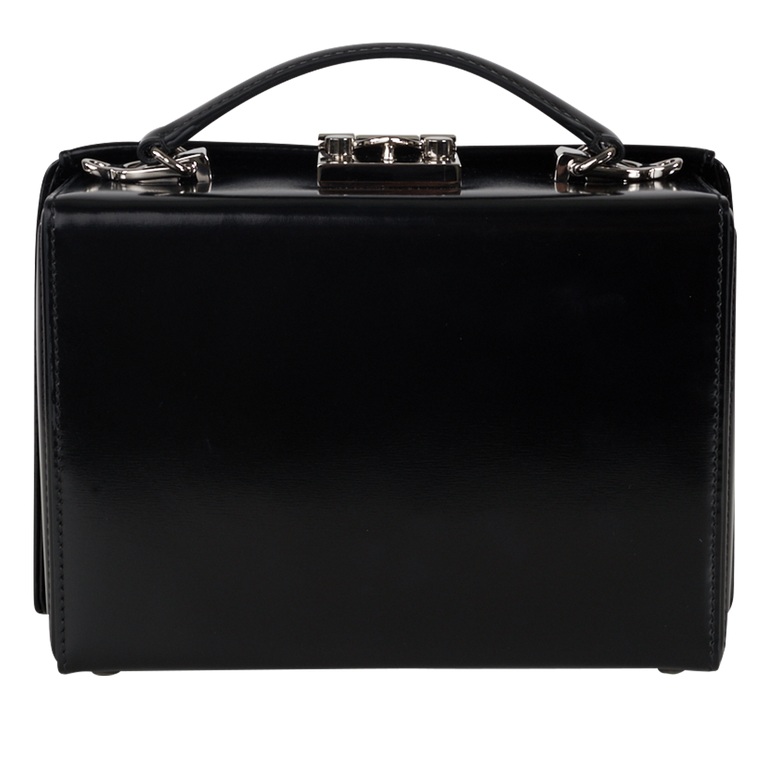 Top-handle bag, structured silhouette, adjustable and detachable crossbody strap, signature Grace lock with key, detachable key hood, internal zip pocket, protective metal feet.