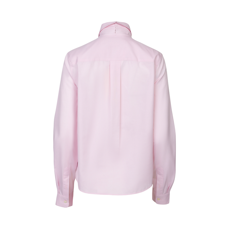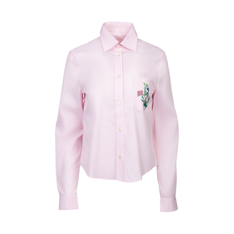 Long-sleeved shirt with point collar, button front and flower embroidery on chest patch pocket.