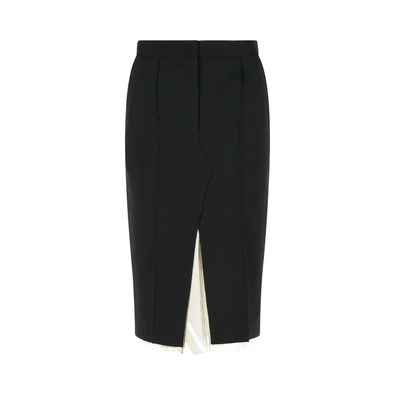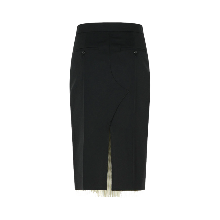 Midi skirt with darts, belt loops, buttoned welt pockets and visible striped lining.
