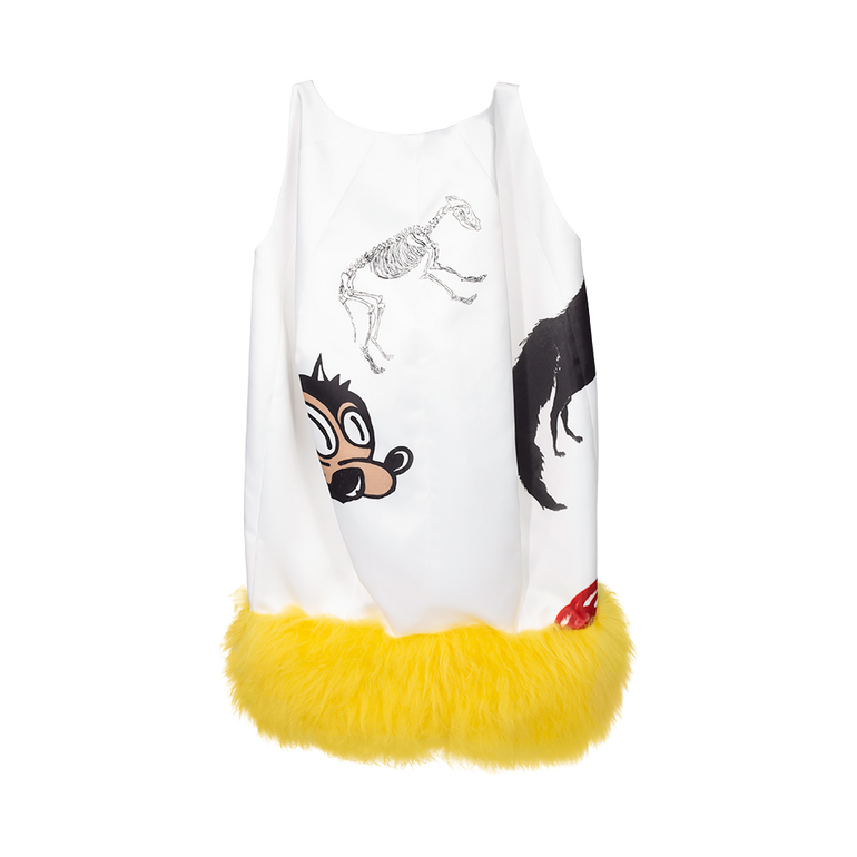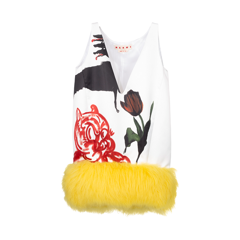 Sleeveless minidress with plunging V-neckline, voluminous balloon silhouette and lamb fur trim at hem. Lined.
