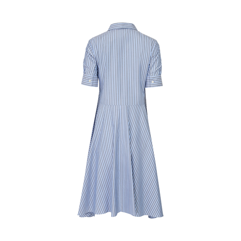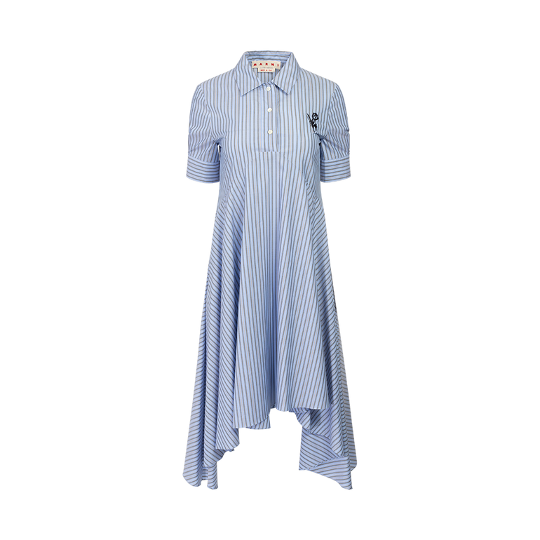 Polo dress with flared hem, button front, handkerchief hem and embroidered floral detail.