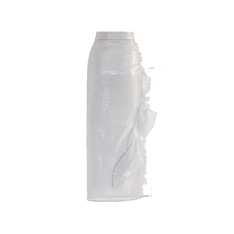 Sequined midi skirt with dramatic asymmetrical ruffle detail and back zip. Lined.