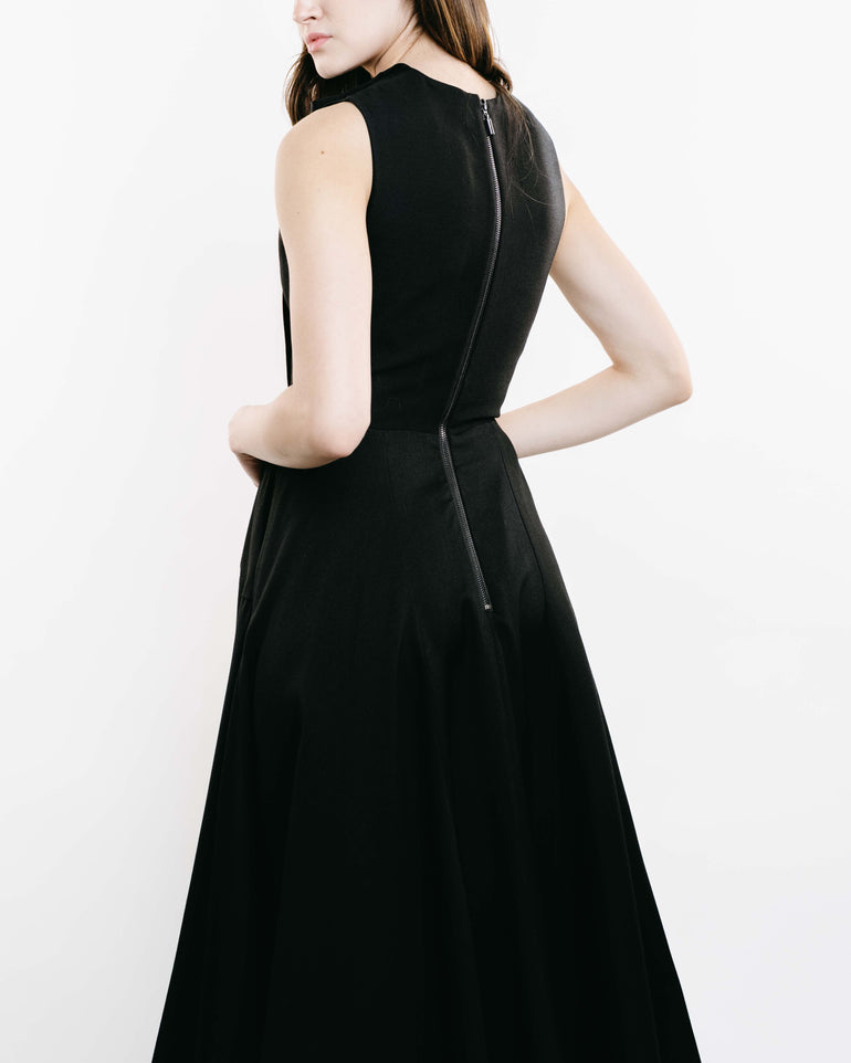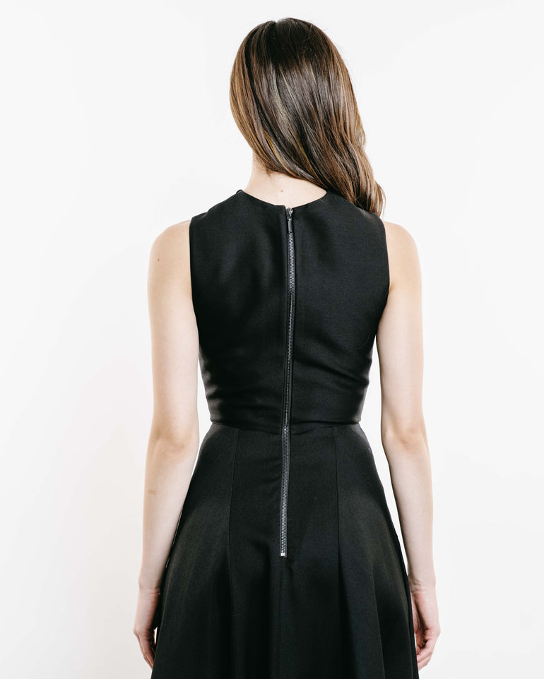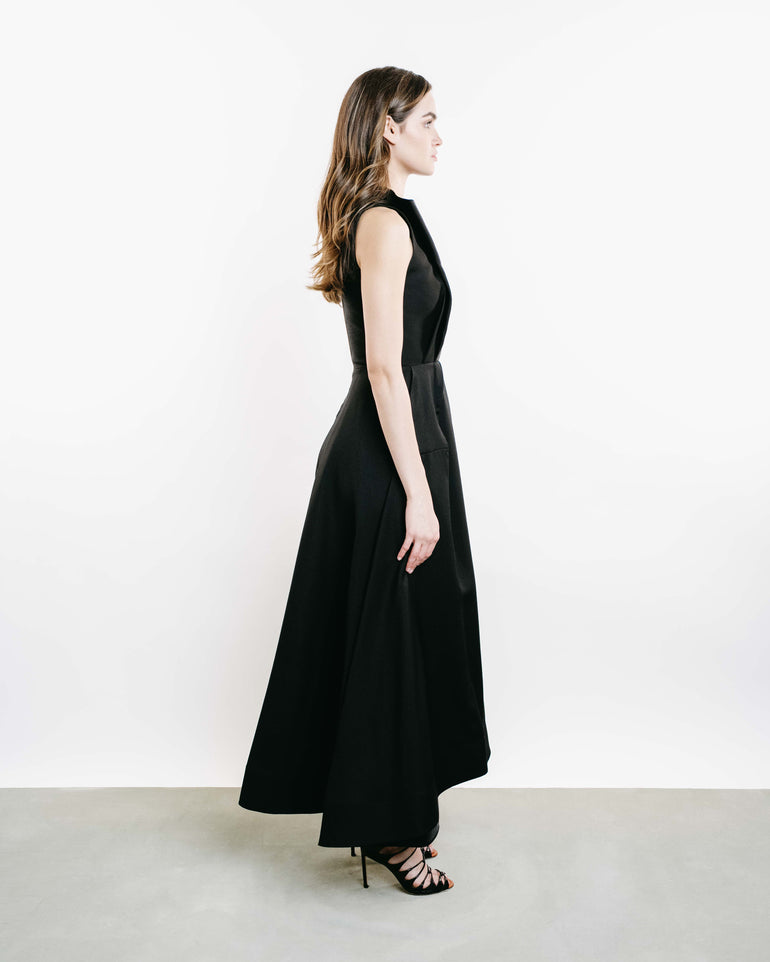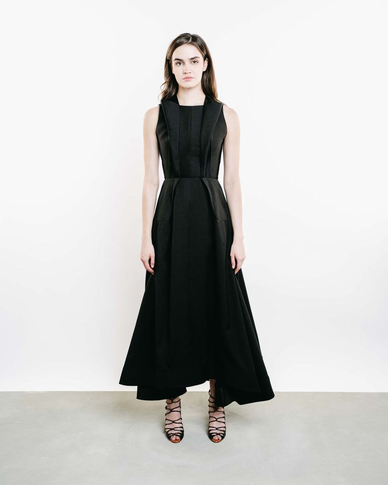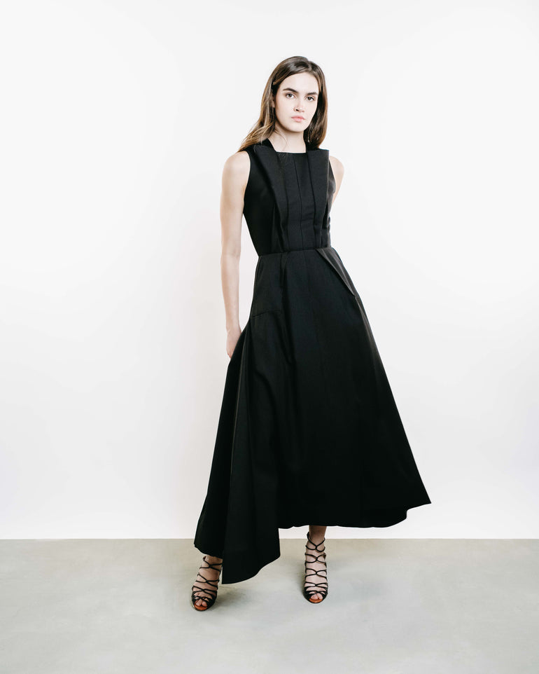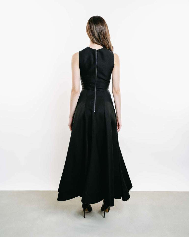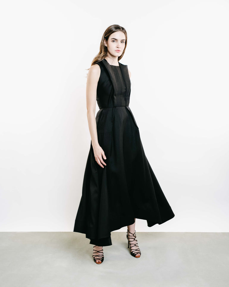 Sculpted midi dress with architectural pleating, high-low hem and back zip. Lined.