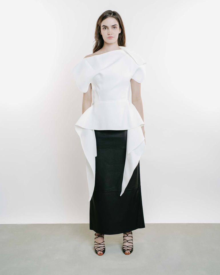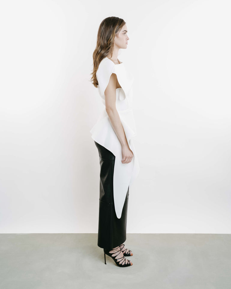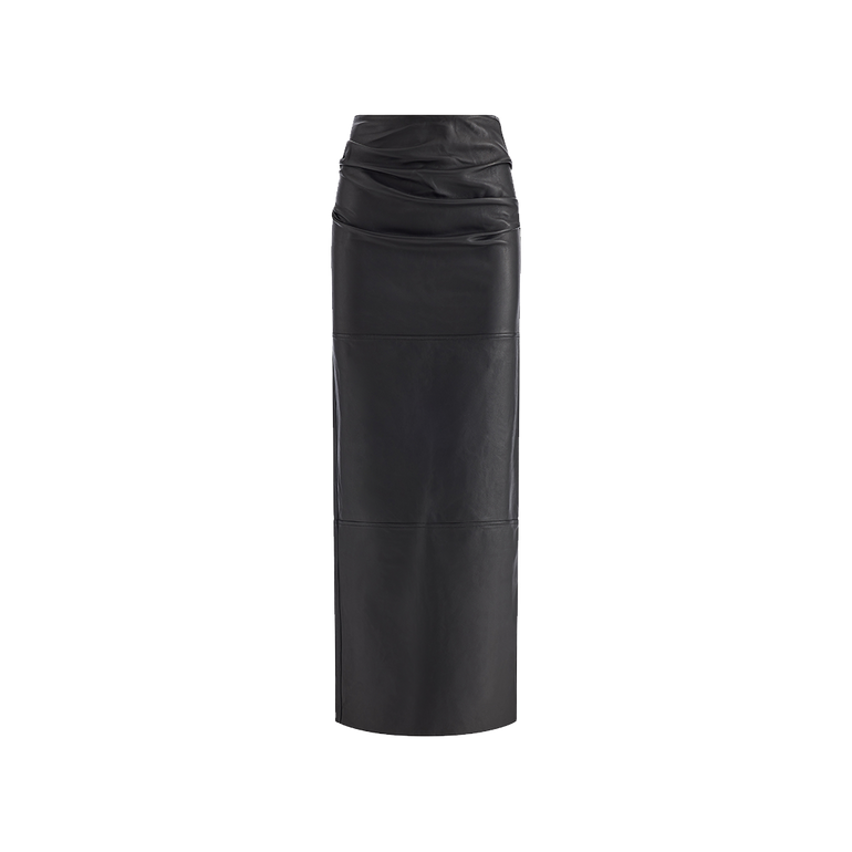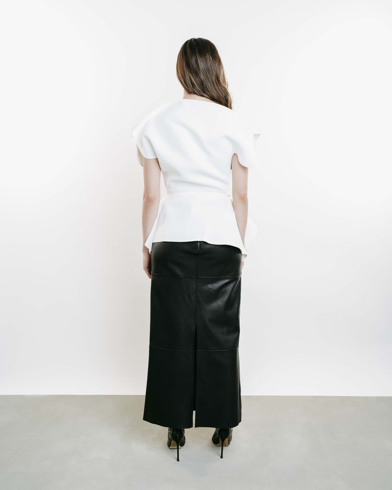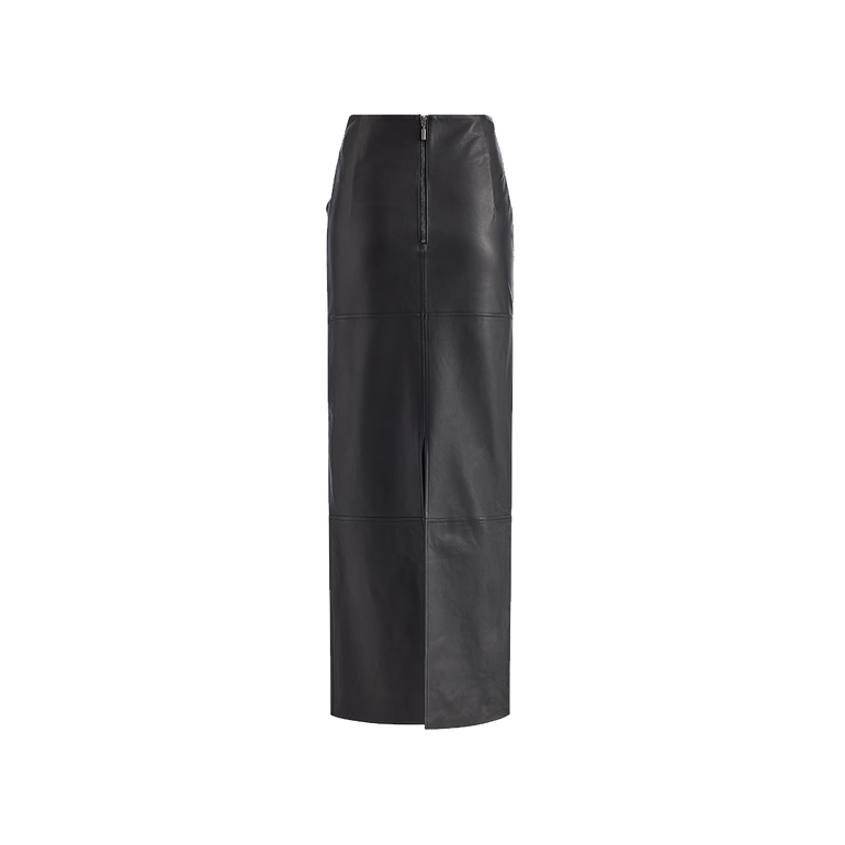 Midi skirt in pencil silhouette with gathered waist, tailored panels, center back split and back zip.