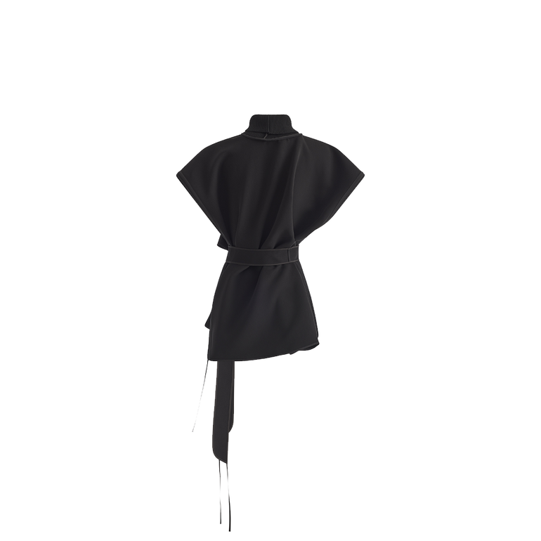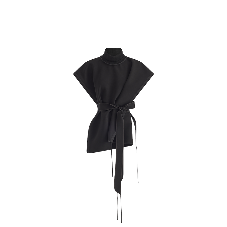 Sleeveless top with high neckline, self-tie belted waist and open sides.