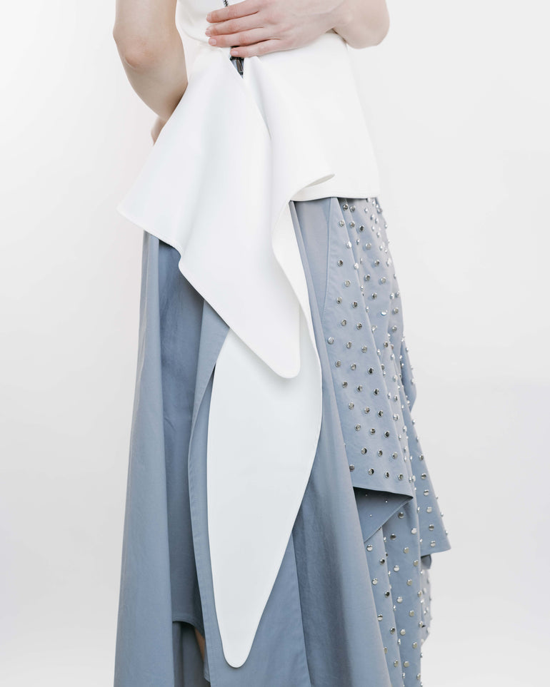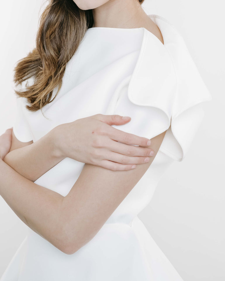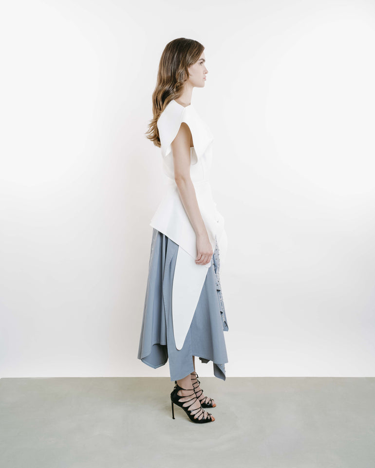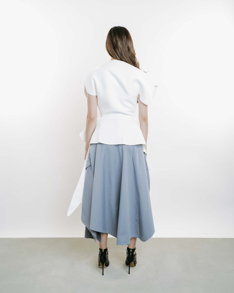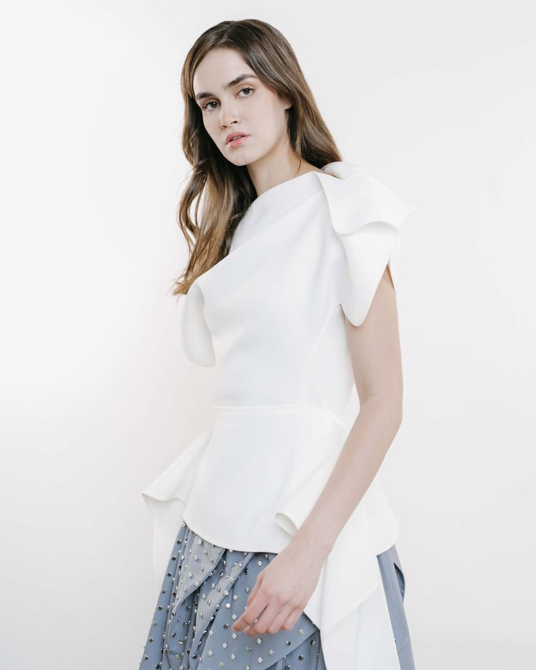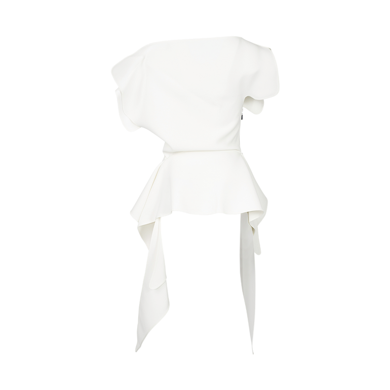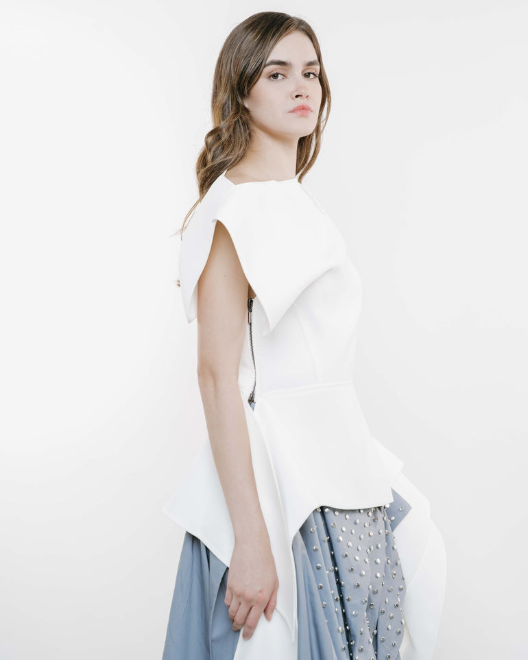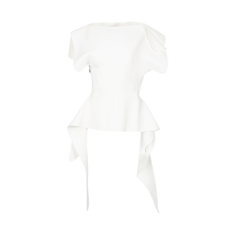 Sculpted top with asymmetric angled neckline, draped peplum across front and side zip.