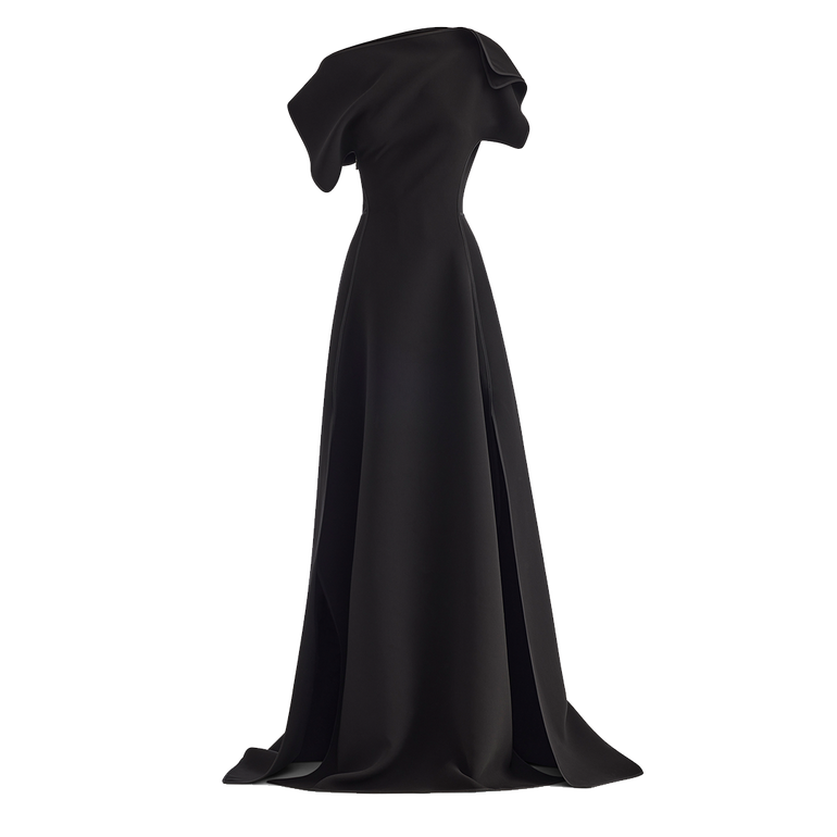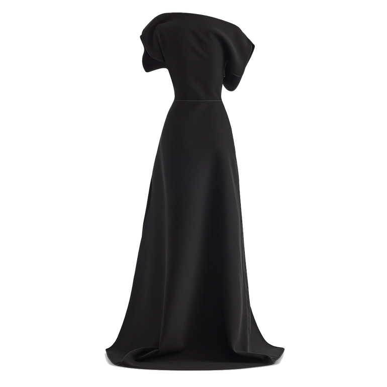 Asymmetrical gown with off-the-shoulder neckline, asymmetric capped sleeves and exposed side zip.