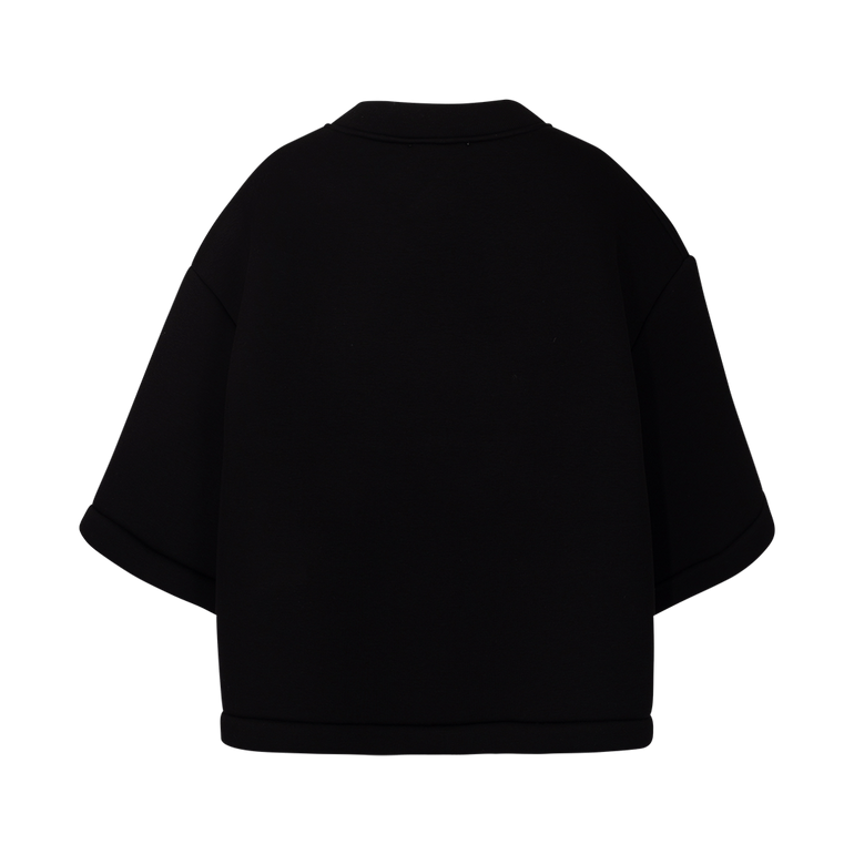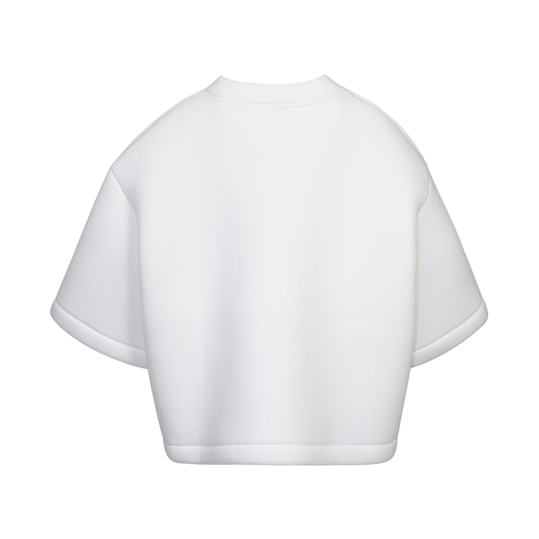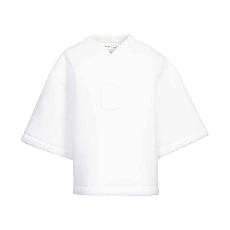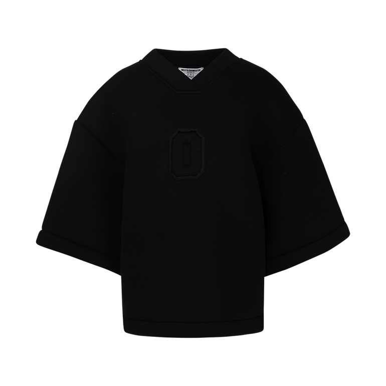 Oversized T-shirt with V-neckline, wide-cut short sleeves and embossed geometric 0 at center chest.