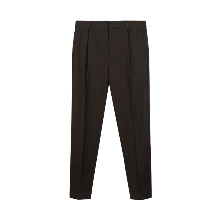 Slim tailored pants with slant pockets, pressed pleats, zip fly with hook and button closure and back welt pockets with buttoned flaps.