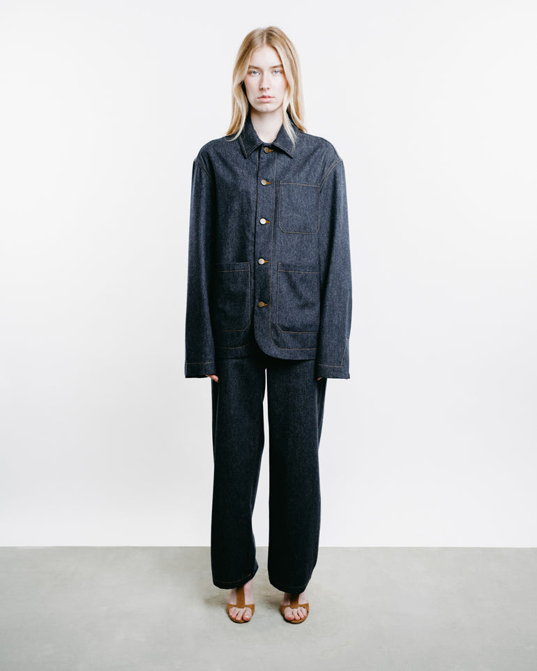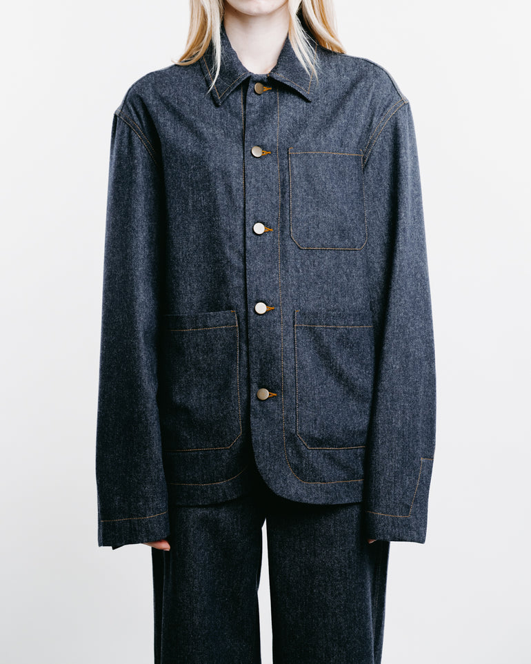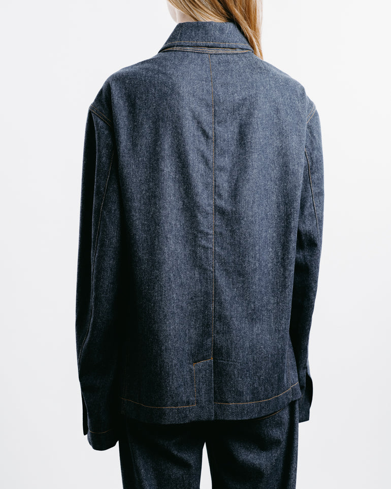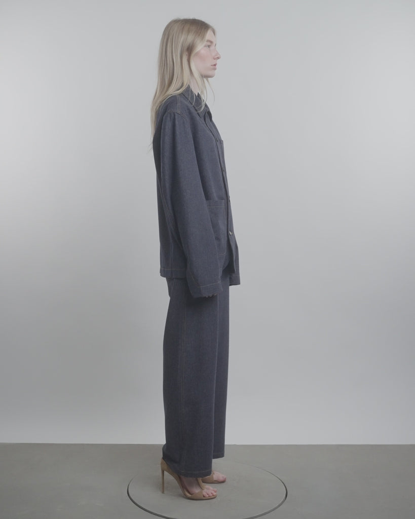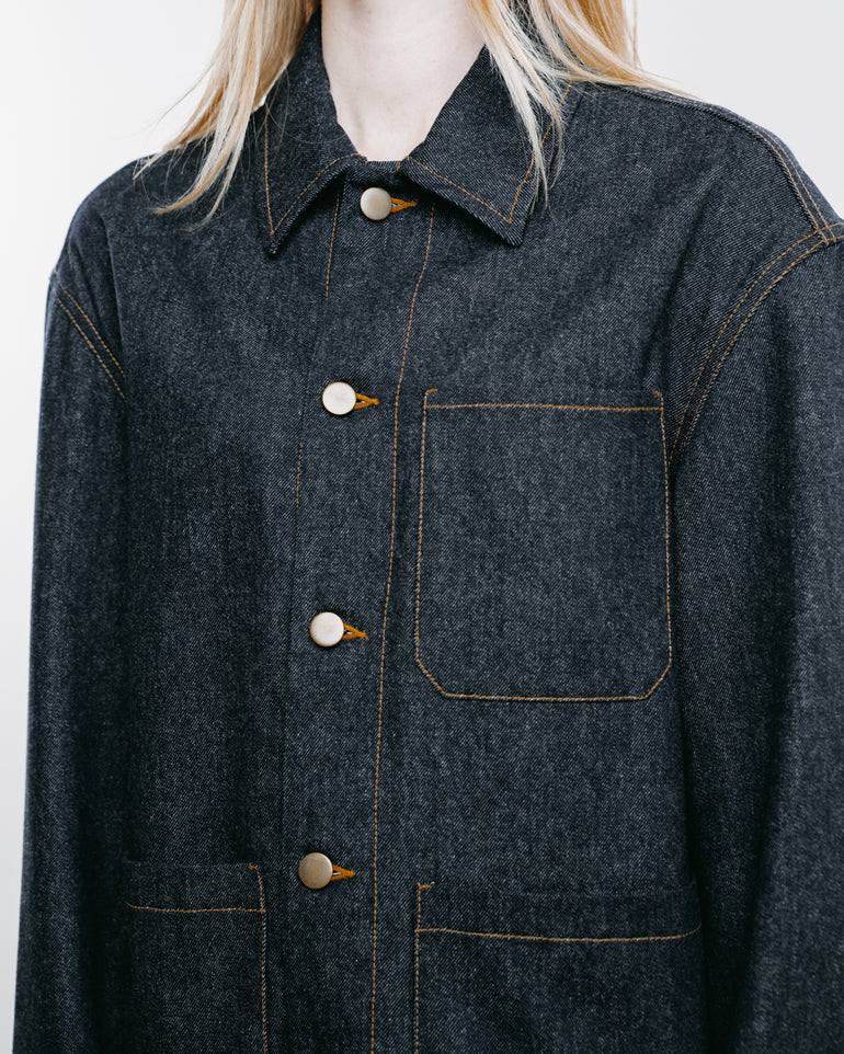 Shirt with high collar, button front, patch pockets and contrasting and reinforced seams.