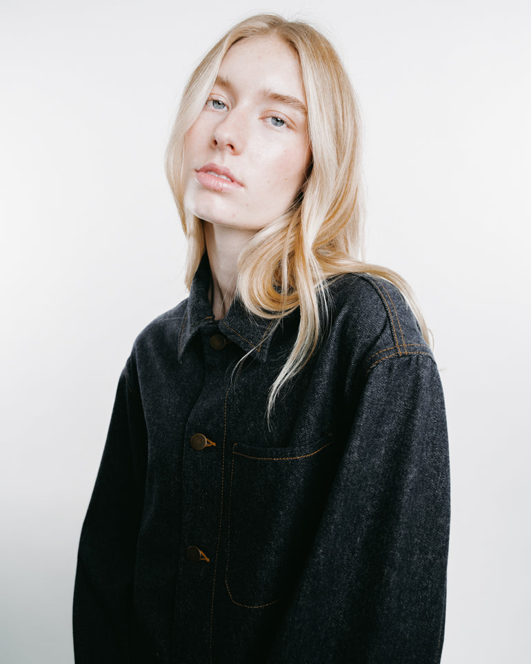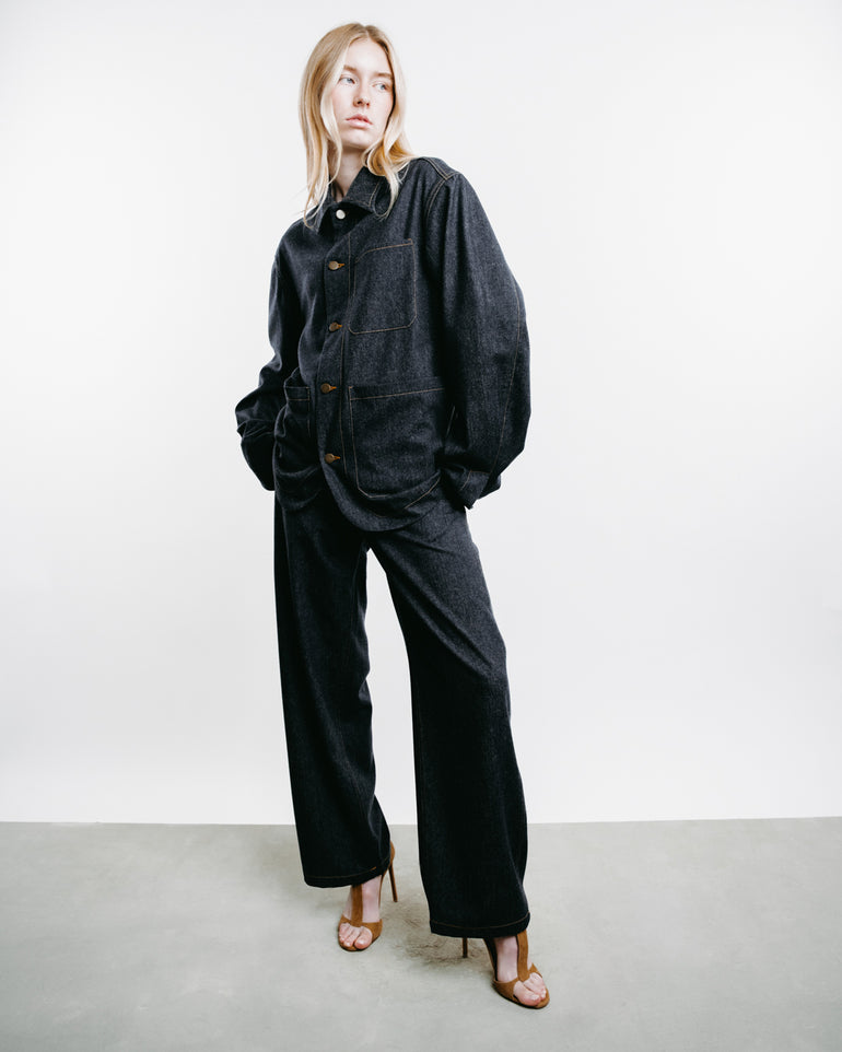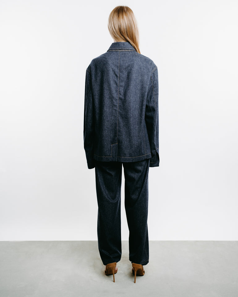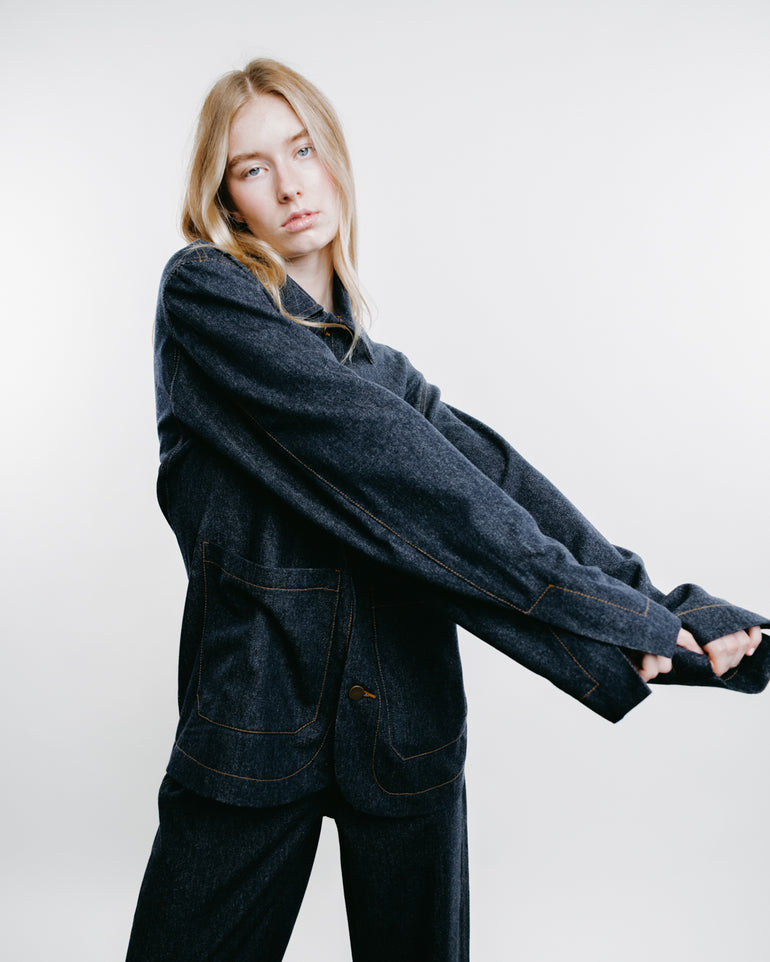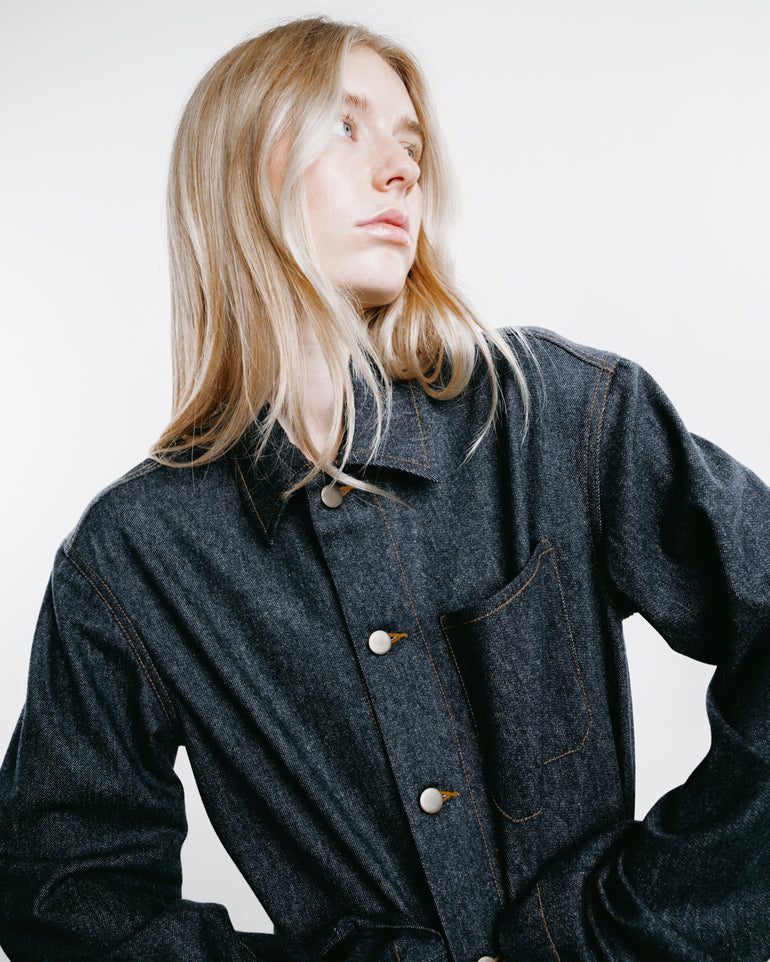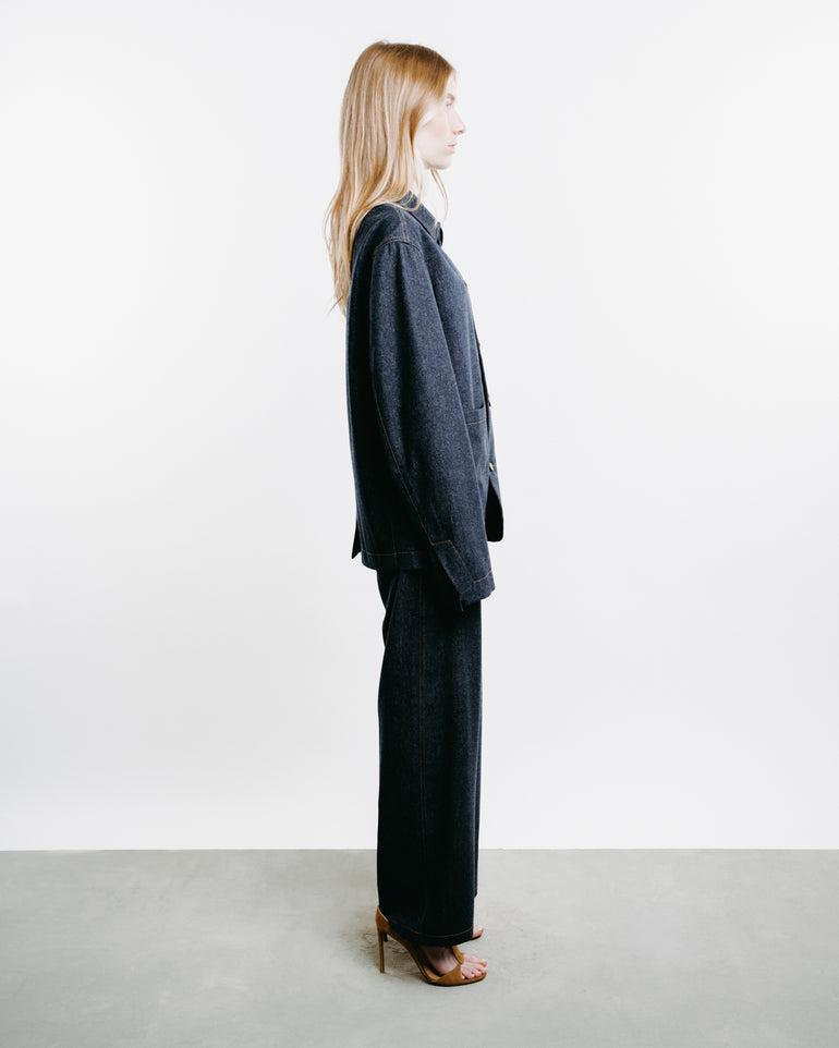 Shirt with high collar, button front, patch pockets and contrasting and reinforced seams.