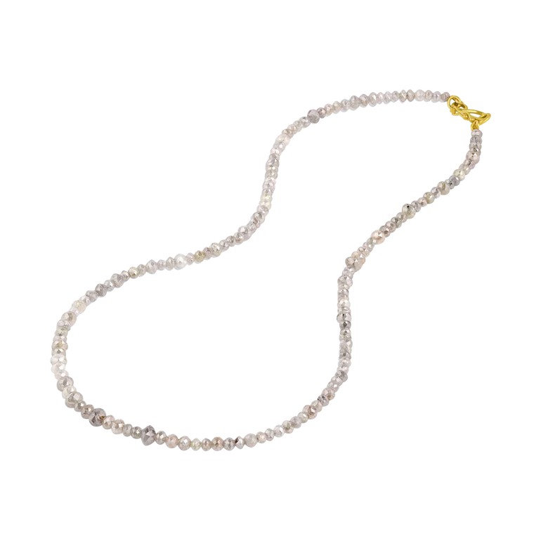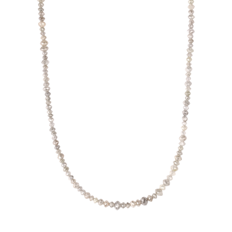 One-of-a-kind necklace with light grey diamond beads and locking clasp. Approx. 16" long with 3.8-5.1MM beads.