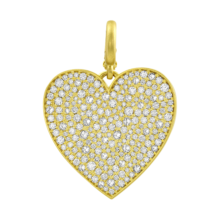 Medium heart pendant featuring approx. 2.53 CT. T.W. diamond pavé, opening bail with safety clasp and "LOVE" engraved on reverse.