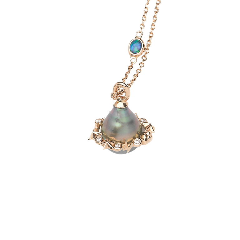 18-karat Rose gold/White Diamonds/Blue Sapphires/Tahitian Pearl.
