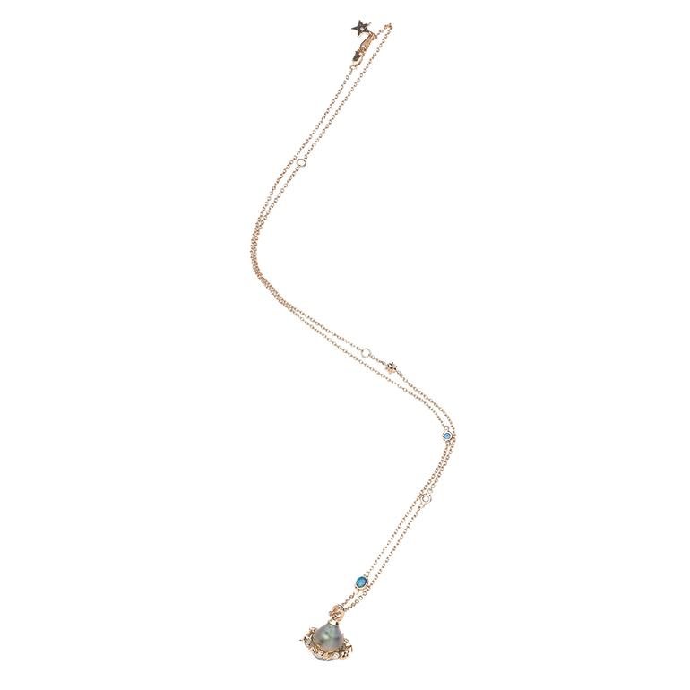 Pendant necklace, Tahitian pearl is the star of this necklace, with the pearl orbited by an 18K rose gold ring, that sparkles with white diamonds to resemble stars. The 18K rose gold chain is also set with white diamonds and blue sapphires along its length.