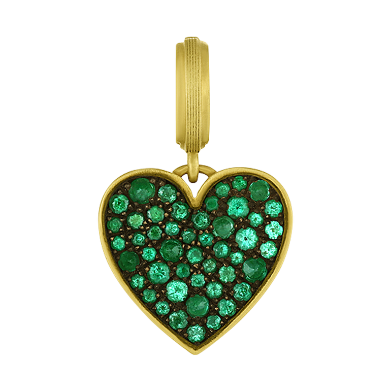 Small heart pendant featuring approx. 0.60 CT. T.W. emeralds, opening bail and "LOVE" engraved on reverse.