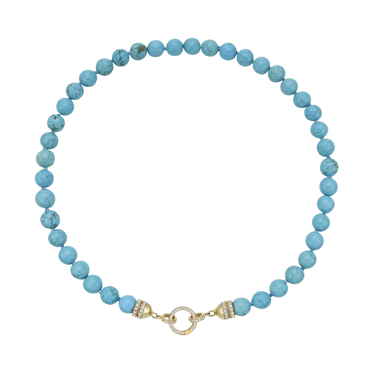Beaded necklace in turquoise with pavé diamond clicker connector.