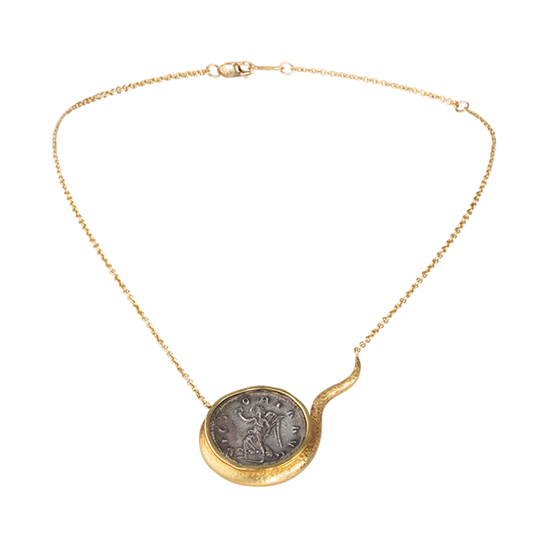 Necklace with authentic Victory coin centerpiece set in textured, hammered 18K yellow gold.