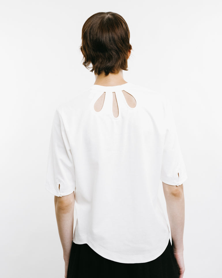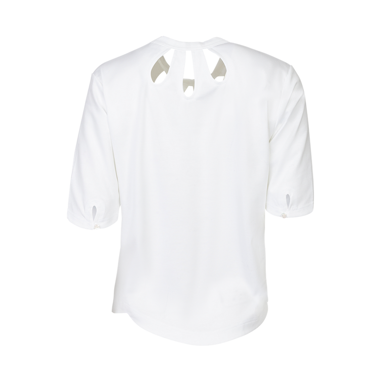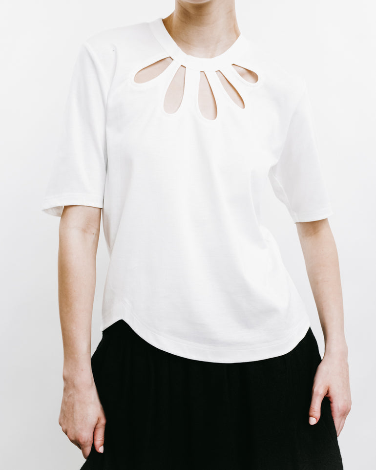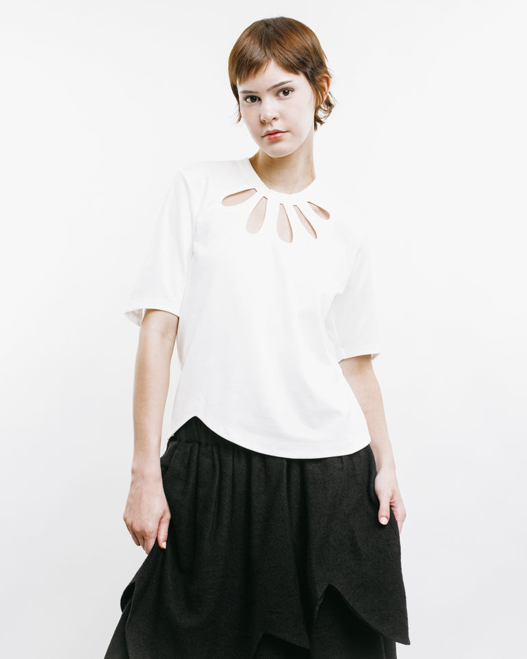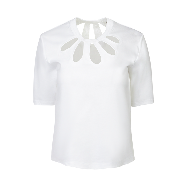 T-shirt with round neckline, petal-shaped cutouts and short sleeves.
