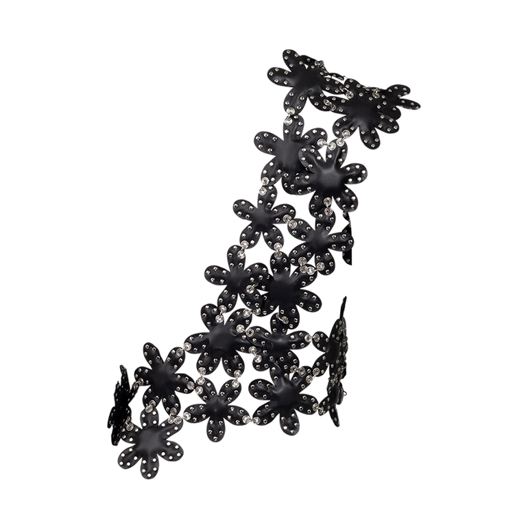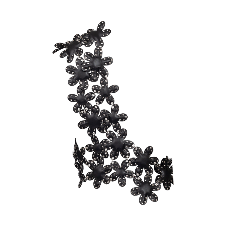 Asymmetric vest in flower design with one shoulder strap and grommet details.