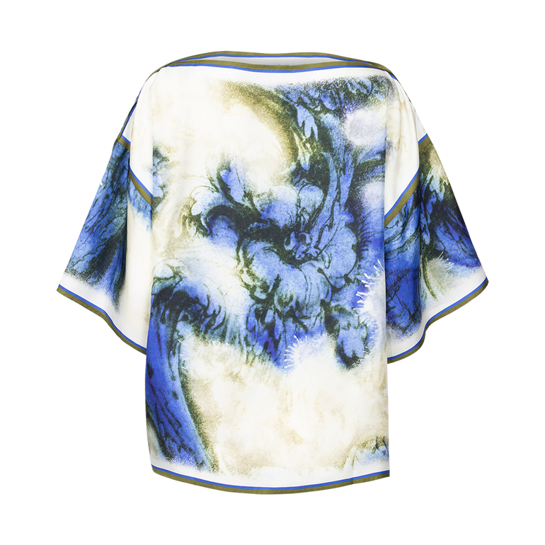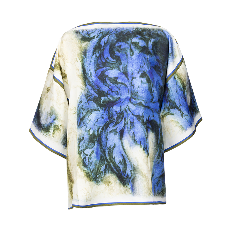 Short-sleeved top in printed silk with boat neckline and hip-length hemline.